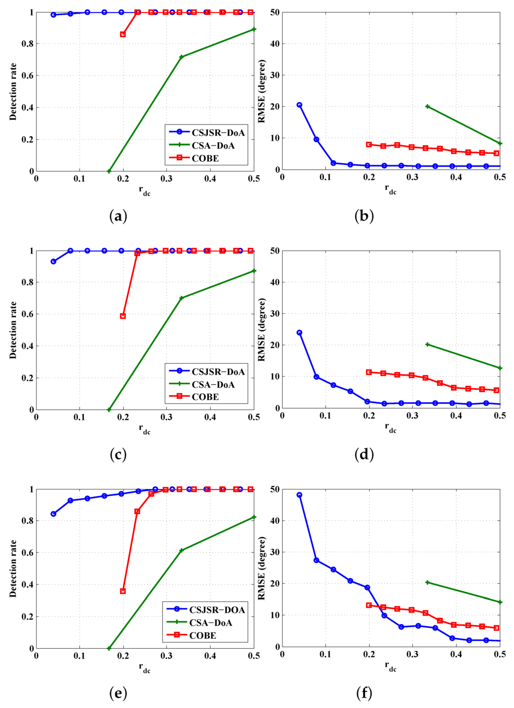 Performance comparison among CS-based methods under the same SNR ratio:(a) Detection rate with SNR = 10 dB; (b) RMSE with SNR = 10 dB; (c) Detection rate with SNR = 5 dB;(d) RMSE with SNR = 5 dB; (e) Detection rate with SNR = 0 dB; (f) RMSE with SNR = 0 dB.
