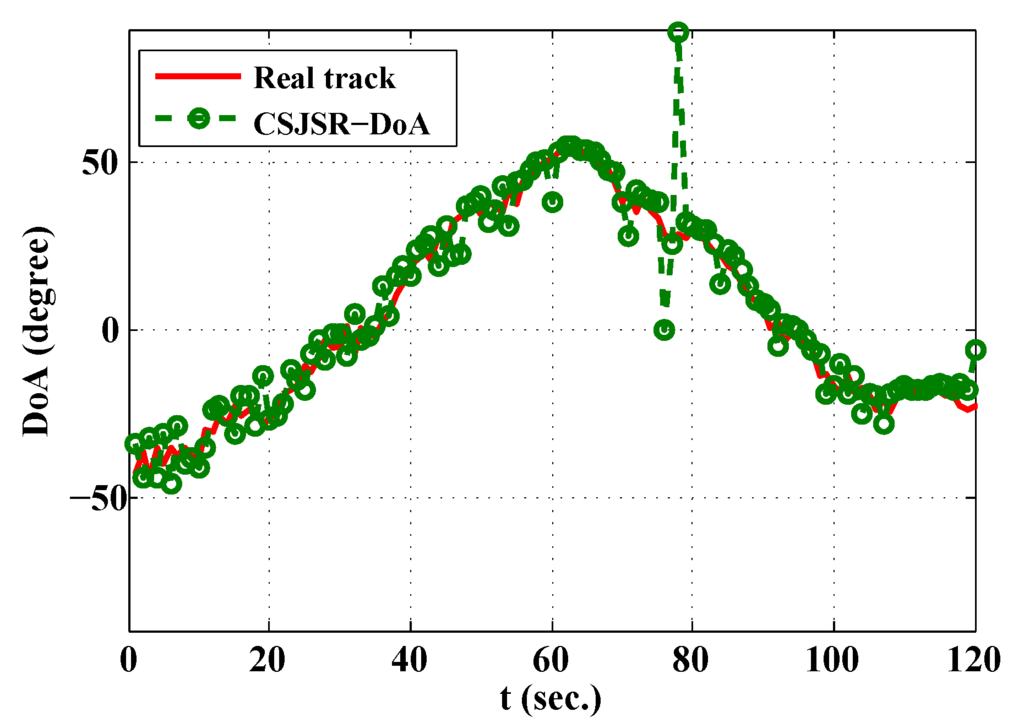 In the first experiment, the task is to track the DoAs of a single moving acoustic source (digital acoustic signal played through a speaker). The distance between the source and the array varies from 20 m to 40 m, and the measured SNR in the array was about 6 dB. Each sensor node took samples during a period of 125 ms at a 2 Ksampling rate and transmitted them to the FC using the IEEE 802.15.4 protocol. In the FC, the DoA estimate was updated every second. The measured data loss ratio was , and the corresponding of the received data in the FC was . The result is shown in Figure 11. The red line is the ground truth, and the green circles are CSJSR-DoA estimates. The averaged probability of success detection is , and the corresponding RMSE is . This experiment provides an example of the practical use of the CSJSR-DoA approach.