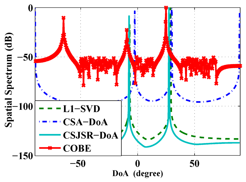 In the second experiment, two stationary acoustic sources are used. They are placed at distances of m and m with (ground truth) DoA angles at and respectively. Six sensors were incorporated into the array with an inter-sensor spacing equal to 0.2 m. Using data collected in this experiment, the performance of the CSJSR-DoA approach is compared against COBE, CSA-DoA and the baseline algorithm L1-SVD. The results are shown in Figure 12 and Table 2. The data compression ratio of all of these algorithms is fixed at . To facilitate the comparison, the corresponding sparse DoA angle vector is normalized and expressed in units of dB. From Figure 12, it is shown that the CSJSR-DoA approach yields sharper DoA estimates compared to the other three methods.