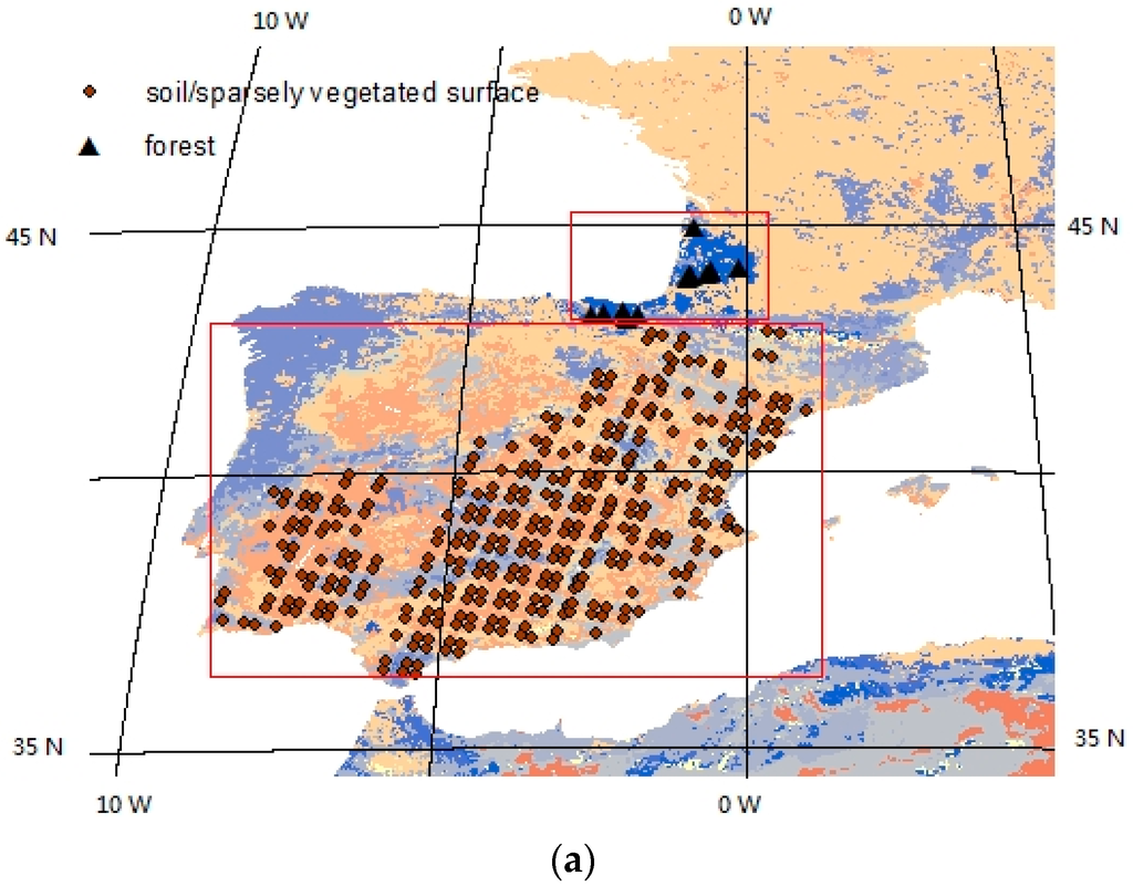 The target areas were the Sahara Desert, the Iberian Peninsula, and a forest area in the southwest of France and the north of Spain (Figure 7). The Sahara Desert has latitudes ranging from 7.0 W to 29.2 E and longitudes ranging from 17.2 N to 33.5 N. The desert surface is a homogeneous land surface. The Sahara Desert was selected because LST retrieved from hyperspectral thermal infrared data over desert surfaces have large uncertainties [28]. The Iberian Peninsula has longitudes ranging from 9.6 W to 0.6 E and latitudes ranging from 36.1 N to 44.0 N. The land surfaces in this area are mainly soil surfaces and sparsely vegetated land surfaces. This area was selected because (1) the sky is frequently clear over this area; and (2) various land surface types can be used for the evaluation. The targeted forest area has latitudes ranging from 42.7 N to 45.4 N and longitudes ranging from 3.4 W to 0.3 E.