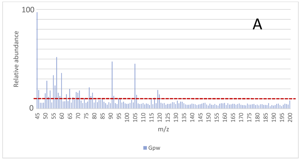 In the case of Gpw and Cpw samples, similar results were obtained regardless of the incubation time, meaning that the equilibrium in the headspace is reached after a few minutes and that an increase in the incubation times does not enhance the signal in a significant way.