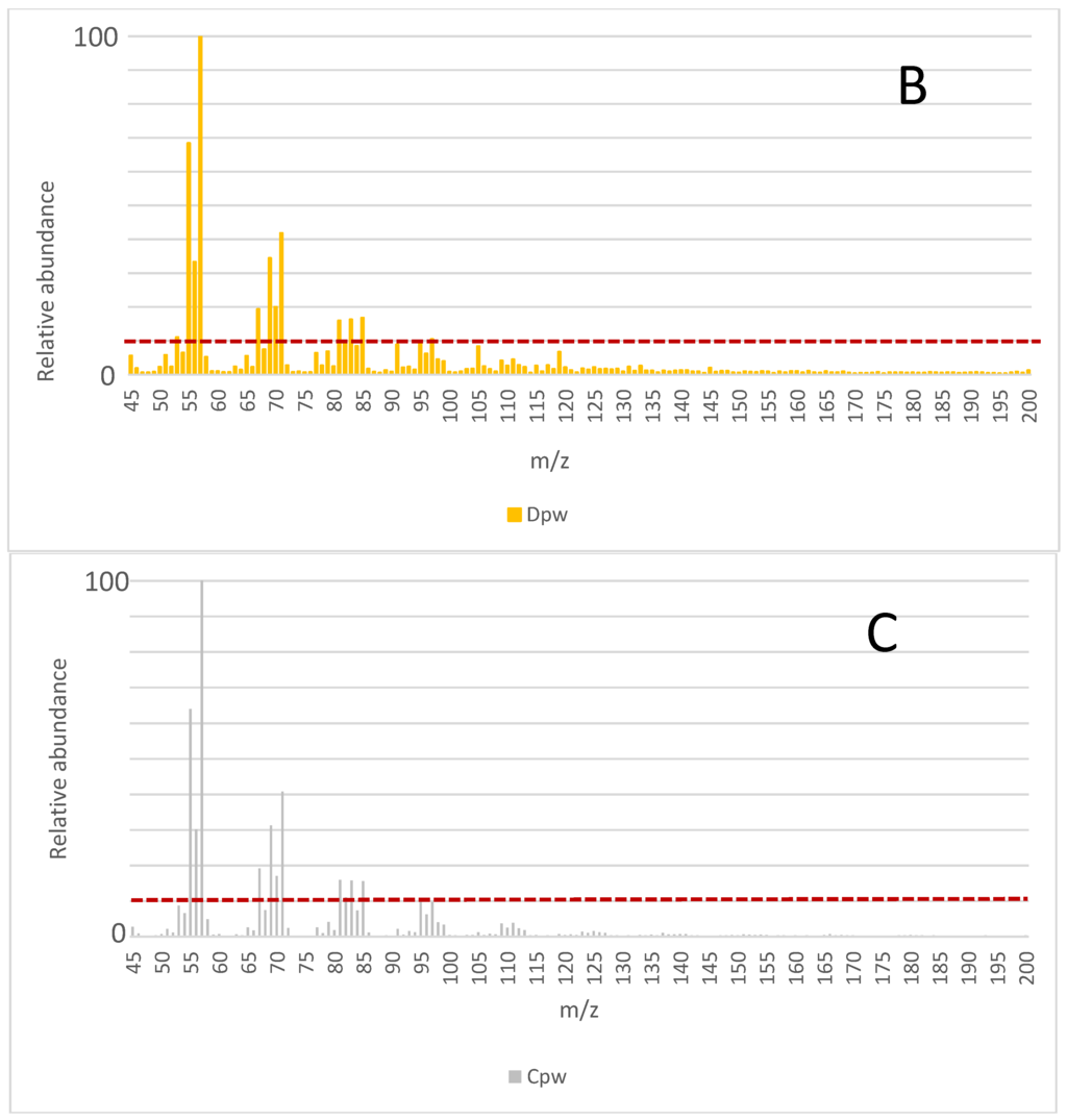 In the case of Dpw samples, the maximum signal was obtained at 130 °C but this did not show significant differences from the results obtained at 115 °C or 145 °C. In contrast, incubation temperatures of less than 100 °C did decrease the signal significantly. It can be seen that a decrease in the temperature from 115 °C to 85 °C led to a decrease in the sum abundance by 50%.