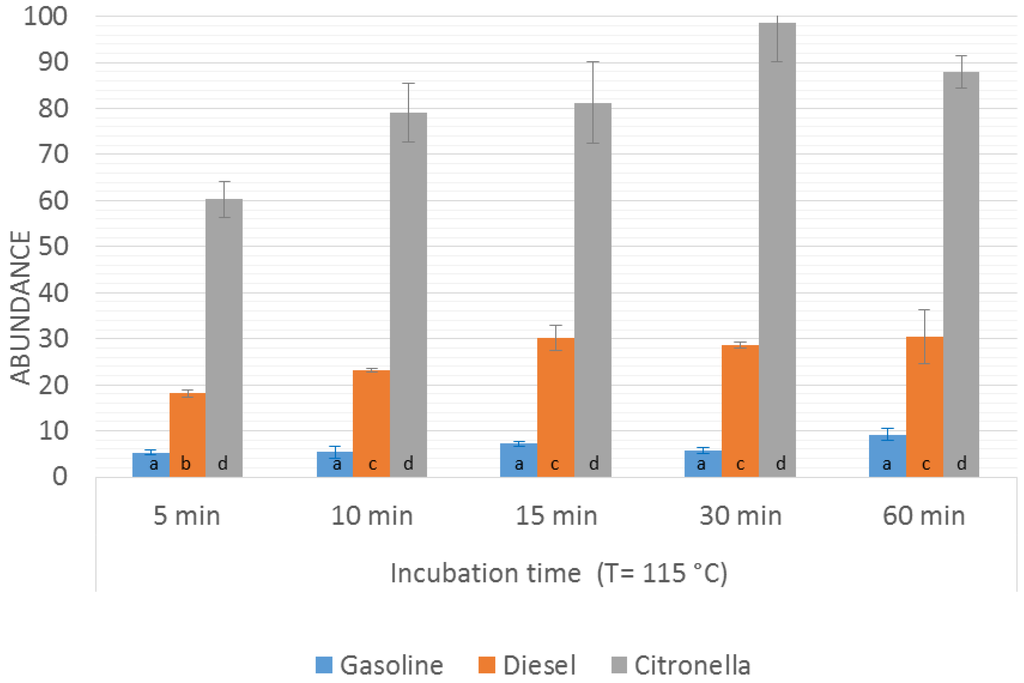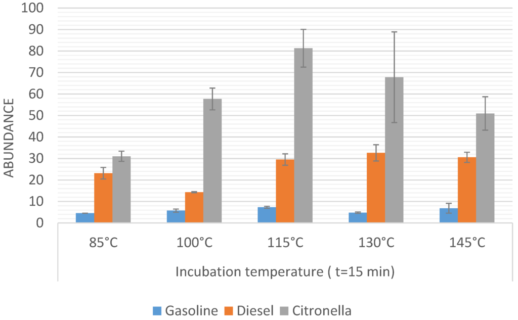 It can be observed that the maximum signal for the gasoline ILR (Gpw samples) was obtained when the samples were heated for 15 min at 115 °C. Significant differences (F < Fcrit) were not observed when the temperature was increased above 115 °C, although there was a significant difference at lower temperature. For an incubation temperature of 85 °C, the signal decreased by 40%.