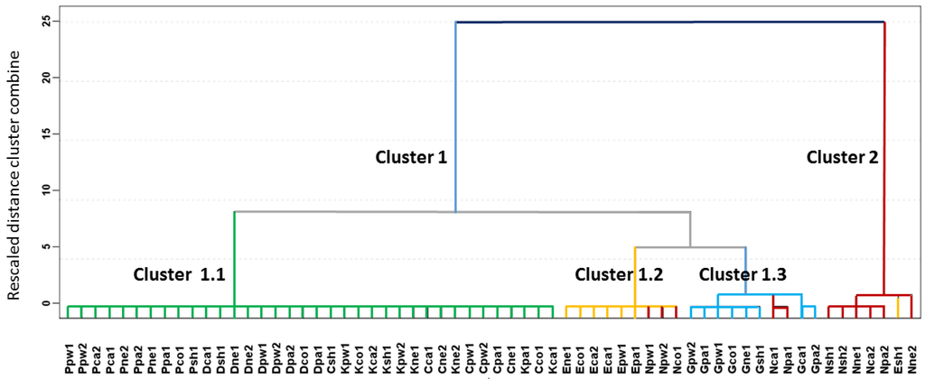 The results of the HCA are represented in the dendrogram in Figure 4, in which all of the samples are listed and the level of similarity (dissimilarity) at which any of the two clusters were joined is indicated. The Ward method was used for cluster preparation and square Euclidean distance was used to measure distances between clusters.