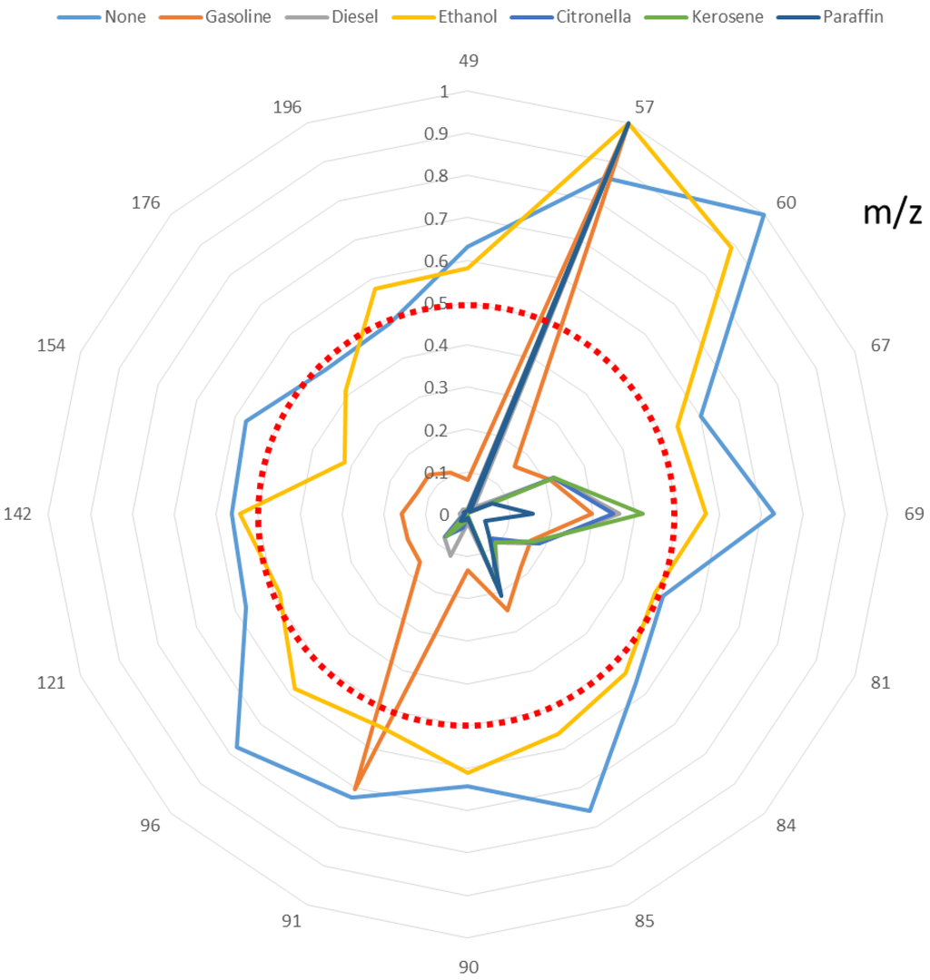 In the work described here, an alternative analytical technique based on E-Nose with a MS detection system (headspace - mass spectrometry electronic nose) for the analysis of ignitable liquids in fire debris is presented. The pattern response obtained by E-Nose is the summed ion spectrum, which is similar to the TIS and is obtained in only a few minutes since chromatographic separation is not required. Moreover, the E-Nose technique was optimized for the analysis of fire debris samples without using any adsorbent to isolate the ILRs and using as the pre-concentration method the static headspace created in the autosampler oven of the E-Nose. The headspace is taken from the vial using a gas syringe and injected into the mass spectrometer without any chromatographic separation. Similar systems based on sensor array detection have previously been used for the initial evaluation of a fire scene [26,27]. However, the use of an array of sensors has several disadvantages such as poisoning, profile masking by some major constituents of the sample, the strong influence of moisture, and the non-linearity of signals [28]. All of these drawbacks are solved by using an MS detector.
