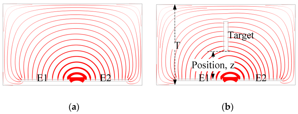 Schematic of electric field lines without a target (a) and with a target () (b). The setting of the boundary conditions in the simulation are as follows: the dielectric of the electrodes and the target are 100 and 52, respectively; the electrical potential of the driving electrode and the sensing electrode are 5 and 0 V; the air boundary was defined as zero charge.