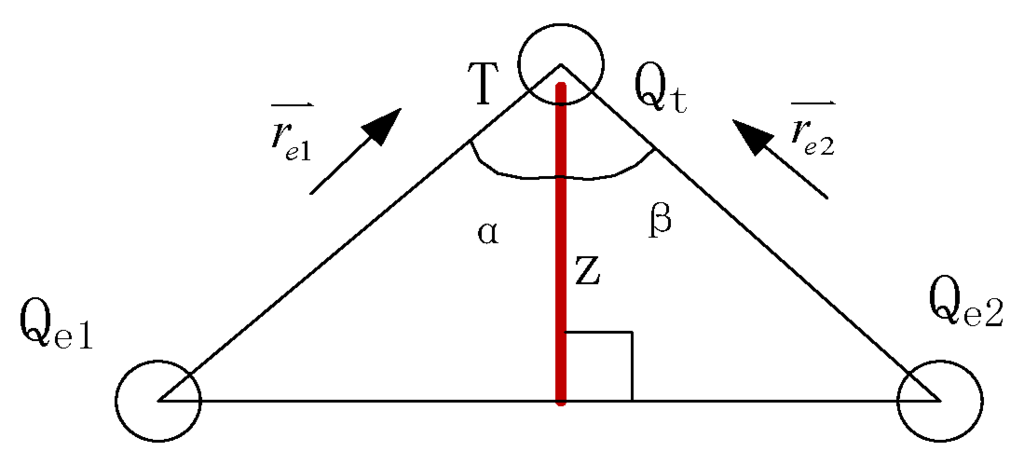 To simplify theoretical analysis, the two electrodes and a target can be modeled as three particles. When the distance z (the distance from the electrode plane to the target face in the Z-direction) is less than T (a maximum field penetration depth), i.e., , the polarization charge is generated on the target because of the electric fields of the driving electrode and sensing electrode. Hence, the contribution of electric fields to the polarization change can be written as: