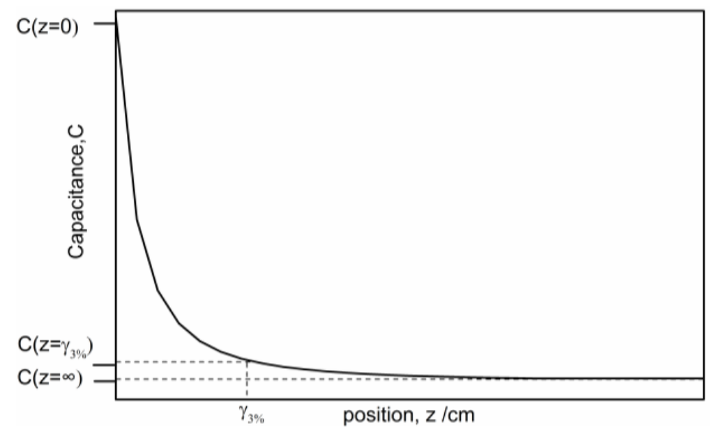 where is the potential of the driving electrode. Because the driving electrode is the source, can be regarded as a constant. Equation (6) shows that the correlation between the capacitance variation, and the distance is . Figure 4 illustrates the capacitance-distance curve. The dynamic range, or the penetration depth, of a planar capacitive sensor can be defined as the position difference in the Z-direction between the position () where 3% capacitance variation occurs and the position where the maximum capacitance change occurs [17], as shown in Figure 4. Hence, the variation of capacitance can be used to detect the moving target.