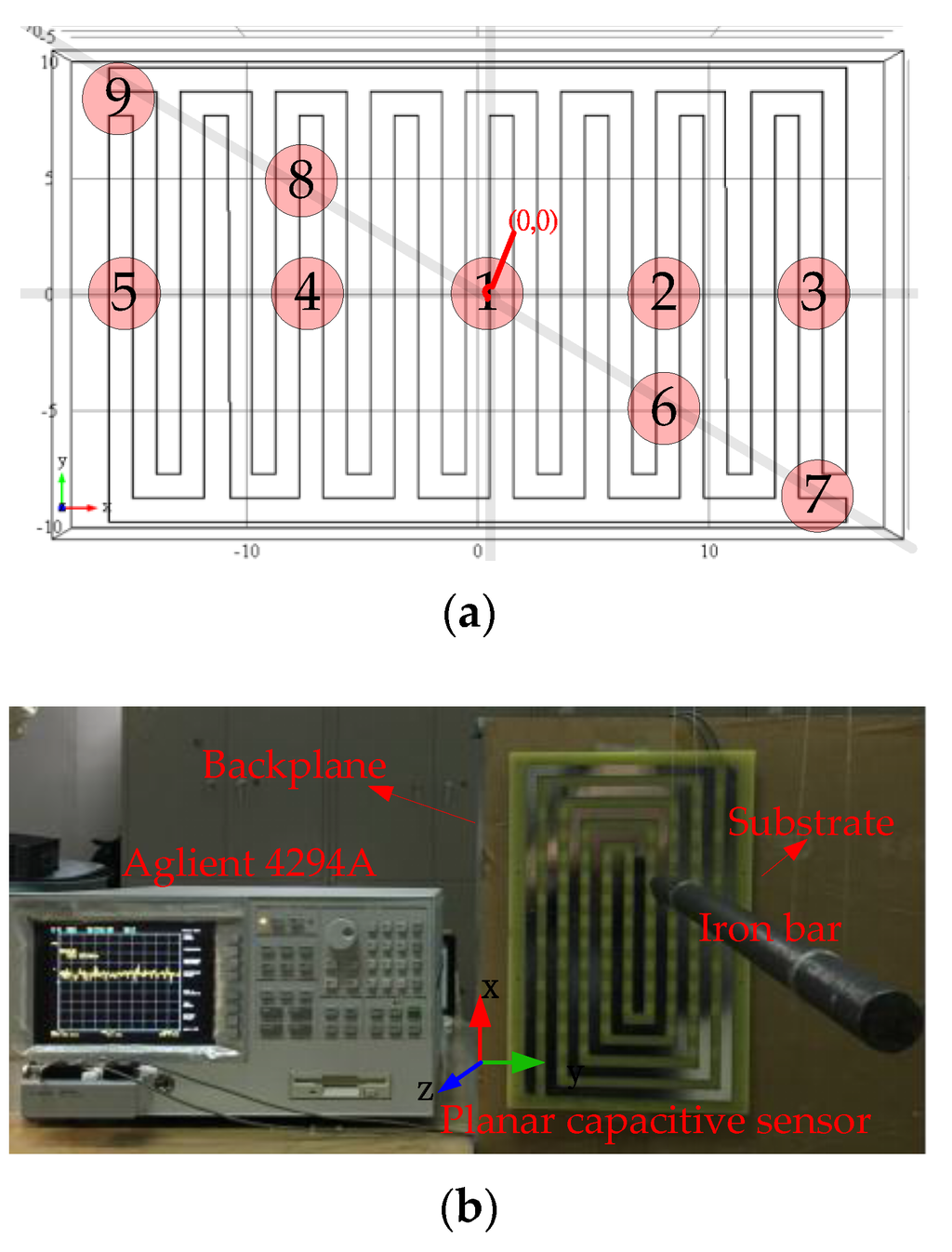 Figure 6b shows an experiment conducted with an Aglient 4294A precision impedance analyzer (Aglient Inc., Santa Clara, CA, USA). The measured object to detect is a static iron bar whose length is 430 mm and diameter is 22 mm. The four tested electrode shapes in the experiment have the same sizes as those in the simulation. The driving excitation frequency and amplitude are set to be 2.3 MHz and 1 V, respectively, and the Direct Current (DC) bias is set to be 4.5 V. The tested planar electrodes and substrate plate are made of tin and flamed FR-4, respectively. Because the four electrode shapes are symmetrical about the center, nine sensitivity positions in the electrode plane are selected as the testing positions, as shown in Figure 6a. The coordinates of the nine sensitivity positions 1#– Direct Current (DC)9# in the XY plane are (0,0), (8,0), (15,0), (−8,0), (−15,0), (8,−4), (15,−8), (−8,4), and (−15,8). The spacings of electrodes are all 1 cm in the four shapes. The axis of iron bar is parallel to the z-axis.