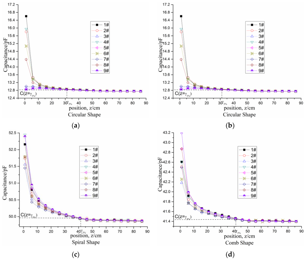 The capacitance variations with the distance (from the electrode plane to the target front face) in the z-axis for the four electrode shapes are shown in Figure 7a–d. Using 1# sensitivity position as the reference sensitivity position, two parameters are defined to evaluate the similarity between the capacitance variation curve at 1# sensitivity position and those at other sensitivity positions: the correlation coefficient and residual standard deviation: