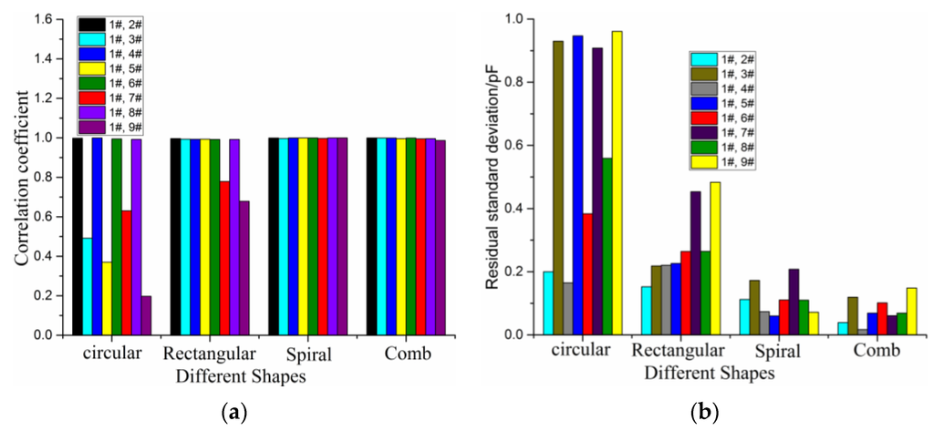 Figure 8a,b shows the correlation coefficient and the average error between 1# sensitivity position and other sensitivity positions for the four electrode shapes. It is found that the curvilinear correlations (all correlation coefficients are more than 99.3%) of the spiral electrode shape and the comb electrode shape are higher than those of the other two electrode shapes. Meanwhile, the standard residual deviations (not exceeding 0.21 pF) of the spiral electrode shape and the comb electrode shape are the lowest. The signal intensity of the spiral shape is 2.53 pF more than that of the comb shape (1.80 pF). Therefore, the spiral shape has the best performance in terms of sensitivity distribution homogeneity, signal intensity and dynamic range, the next is the comb shape, the third is the rectangular shape, and the circular shape has the worst performance. In summary, the spiral shape is the optimal electrode geometry among the four shapes under consideration.