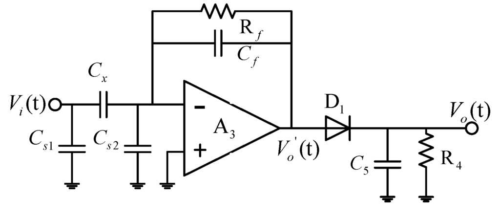 For the output of operational amplifier , the amplification of signal is limited by the high-voltage limit of the amplifier. In this paper, a C/V circuit with a diode half-wave rectifier capacitor filter circuit is used. The C/V circuit converts the variation of capacitance to the variation of a DC signal. Generally, when “” is satisfied, the output signal becomes smooth and stable. When and are selected to be 10 nF and 1.5 kΩ, respectively, the response time is about 45 μs (). The output of the half-wave rectifier can be expressed as: