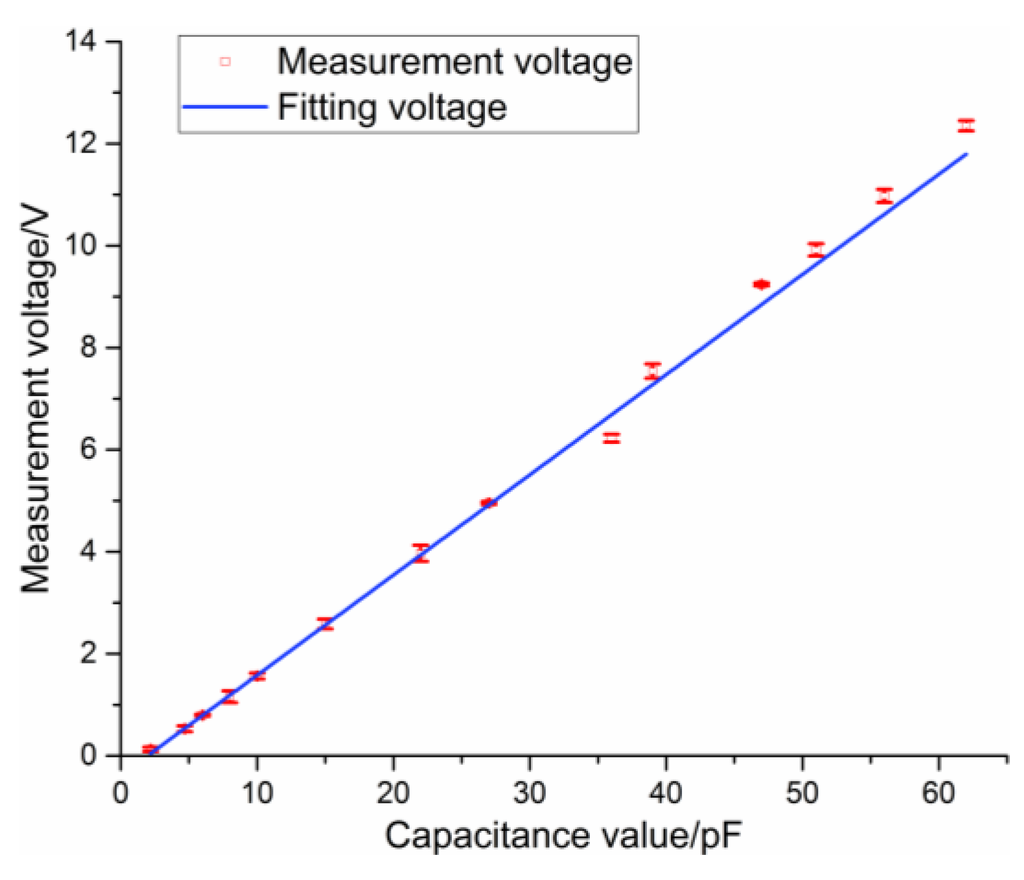 where is a constant related to the load. The measurement results showed that is about 0.87. Then, the sensitivity of the C/V circuit is 0.21 . The input–output curve of the C/V circuit is shown in Figure 11, which shows that the maximum absolute error and linearity error are 0.55 pF and 0.83%, respectively.