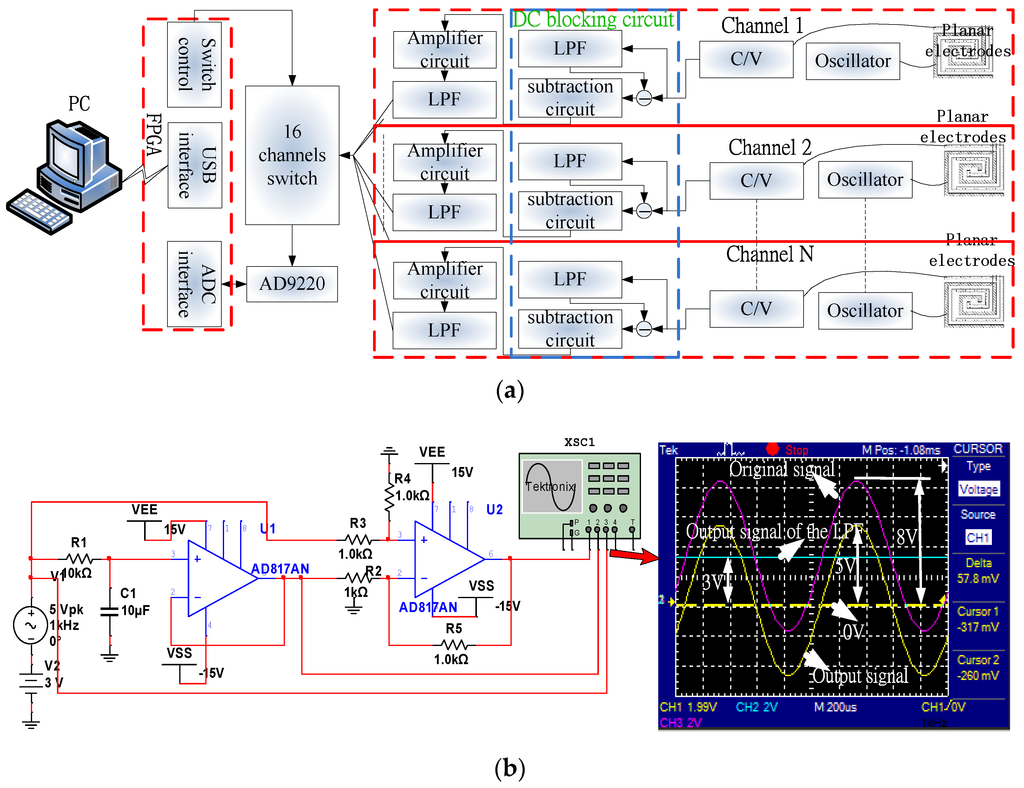 Illustration of (a) the digital capacitance measuring circuit and (b) the DC blocking circuit. The DC blocking circuit consists of an LPF and a subtraction circuit. The LPF is to filter AC signals by setting a lower cutoff frequency and is subtracted from the original signal. In a simulated experiment, the input was a 5 V sine signal of 3 V DC bias; the output of the LPF is 3 V DC voltage and the output of the subtraction circuit is a 5 V sine signal.