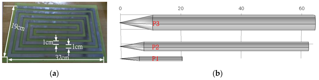 (a) Prototype of the spiral electrodes and (b) schematic view of three projectiles.