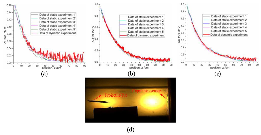 In the dynamic experiments, the average speeds of 1048, 400 and 700 m/s are tested for the three projectiles. The projectile flight paths are measured by using a high-speed camera system with measurement speed at 21,000 fps. The sampling rate for each channel of capacitance measuring circuit is 191 kHz. The voltage signals are sampled using AD9220 (the input voltage range from 0 V to 5 V). To compare the data of dynamic and static experiments, the output signals of the C/V circuit are taken as the data of static experiment. All the sampled signals in the experiments are amplified by two times.