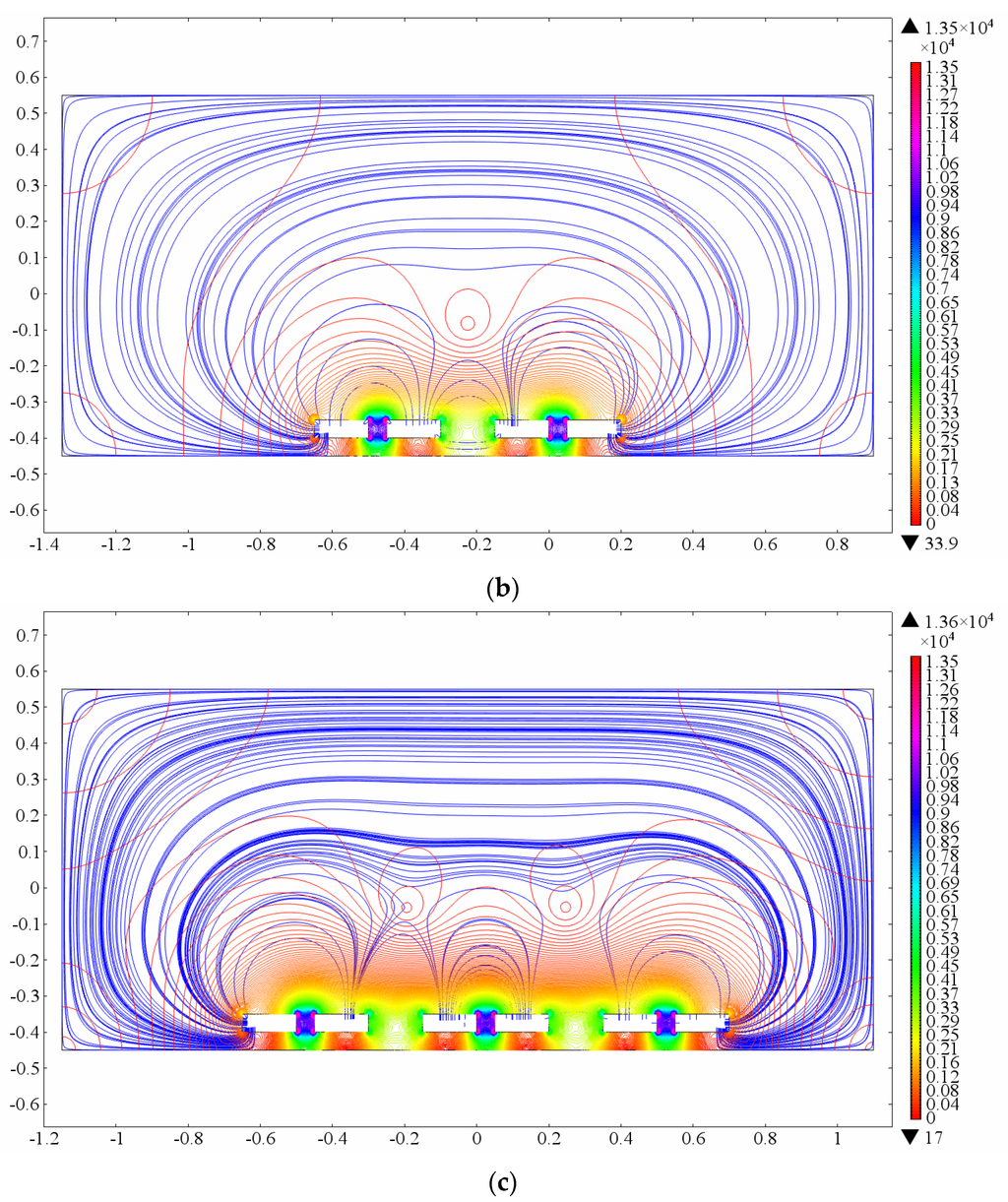 The sensitivity distributions of the four electrode shapes are simulated with the finite element method (FEM) method using the software COMSOL Multiphysics (version 5.0, COMSOL Inc., Burlington, MA, USA). In each finite element (FE) model, the electric potentials of the driving electrode and the sensing electrode are set to be “5 V” and “Ground”; the volume of the computational domain is 35 cm × 20 cm × 10 cm; the mesh generation density is set to be “Extremely fine”; and the mesh number is set to be 385,740.