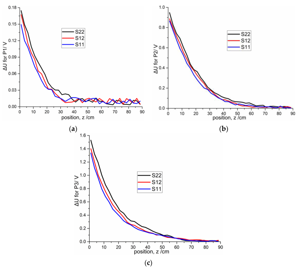 Figure 16 shows the results of the static measurements using , and for the three projectiles. The same trend exists in the static experiments results for the three projectiles: the voltage variation of is larger than those of and . The voltage variations of and are 14.11% and 4.35% lower than , respectively, for P1, 8.74% and 5.84% lower than , respectively, for P2, and 12.57% and 8.37% lower than , respectively, for P3.