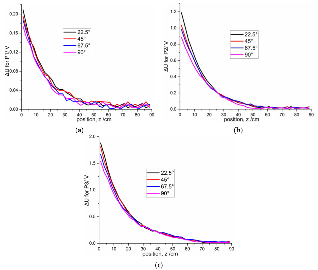 To investigate the influences of different attack angles on signal intensity variation, twelve independent experiments are performed. Figure 17a–c shows the variation of signal intensity with angle of attack (22.5°, 45°, 67.5°, and 90°) for the three projectiles. The angle of attack (α) is defined as the angle between the projectile axis and z-axis. For the convenience of measurement, the projectiles remain parallel to the z-axis and flies along the projectile axis, and the sensor plate rotates to make an angle β (α = β) with the Z-axis (as shown in Figure 1). The same trend exists for the voltage value: when the angle of attack decreases, the sensor signal strength increases, especially within distances from 1 cm to 40 cm. Compared to the sensitivity at 90°, the sensitivities at different attack angles are enhanced by 20.11% (22.5°), 11.97% (45°), and 7.50% (67.5°) for p1; 33.81% (22.5°), 16.22% (45°), and 10.7% (67.5°) for p2; 22.21% (22.5°), 17.51% (45°), and 8.47% (67.5°) for p3. This trend can be explained by the polarization surface of the target increasing with the decrease of angle of attack.