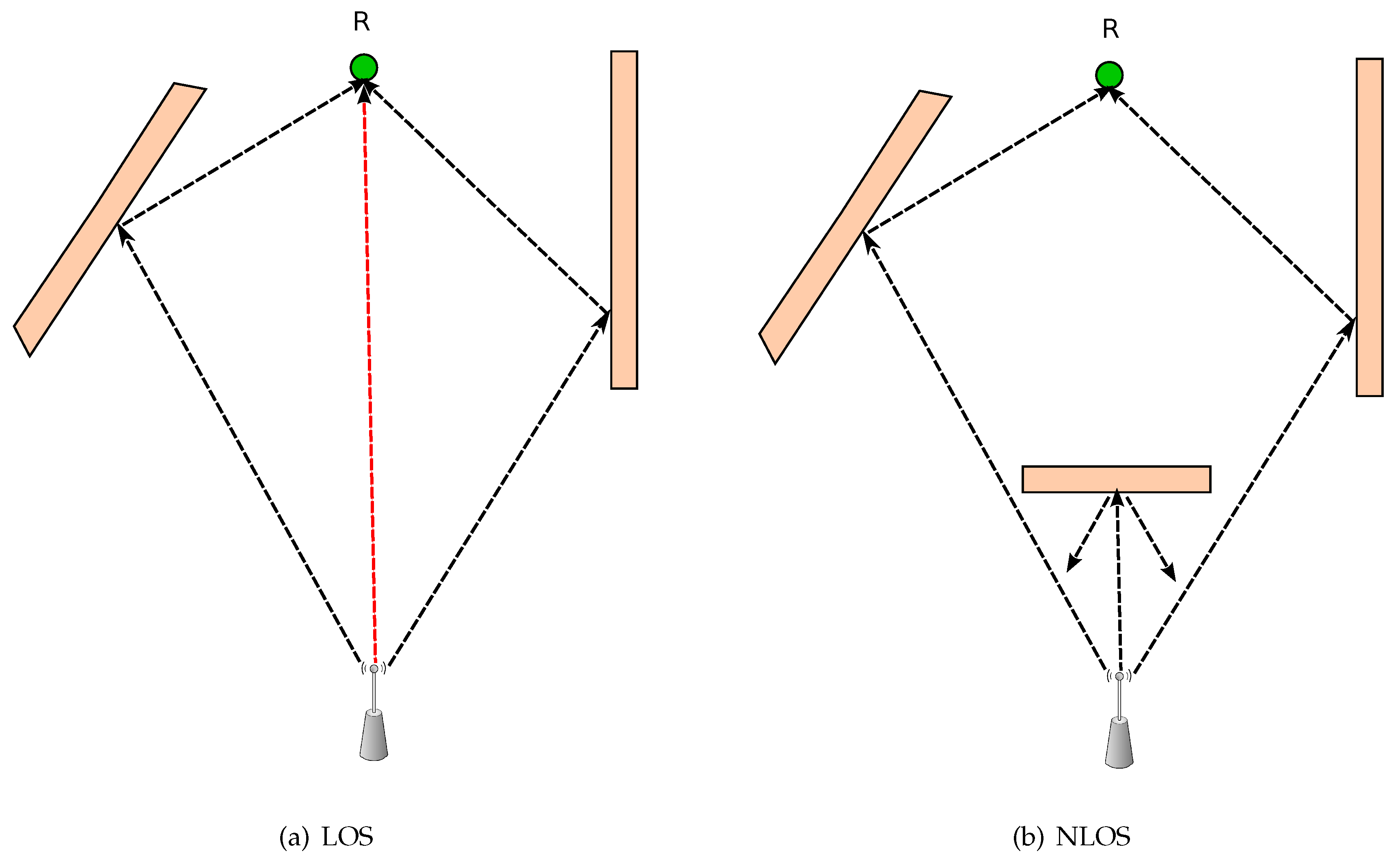 (a) Line-of-sight (LOS) vs. (b) non-line-of-sight (NLOS).