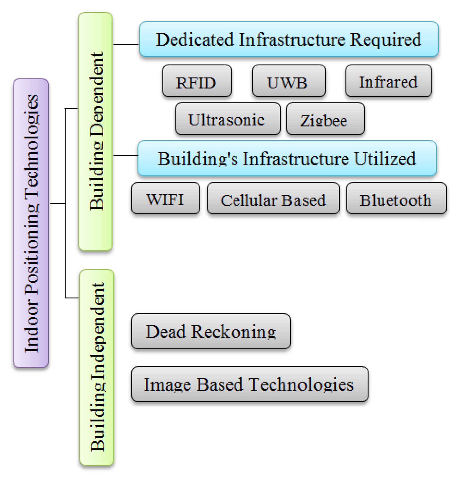 Various indoor positioning technologies can be used concurrently to gain the advantages of each one. The appropriate indoor positioning technology should be selected carefully in order to make the right balance between the complexity and the performance of IPSs [2,5]. Indoor positioning technologies are classified by researchers in many different ways. In 2003, Collin et al., classified indoor positioning technologies into two classes according to the need for hardware: technologies that require special hardware in the building and self-contained technologies [22]. On the other hand, Gu et al., provided different classifications of indoor positioning technologies in 2009, in which they divided them, into two classes based on their need for existence of networks: network-based and non-network-based technologies [5]. The authors also classified indoor positioning technologies according to system architecture into three classes: (1) self-positioning architecture, in which objects calculate their positions by themselves; (2) infrastructure positioning architecture which estimates the locations of the targets using the infrastructure to find if the target is in the coverage areas and track it; and (3) self-oriented infrastructure-assisted architecture which depends on the system that calculates positions and then sends them to the tracked target in response to its request. In addition, they classified indoor positioning technologies into six classes based on the main medium for determining positions: (1) infrared (IR) technologies; (2) ultra-sound technologies; (3) radio frequency (RF) technologies; (4) magnetic technologies; (5) vision-based technologies; and (6) audible sound technologies.