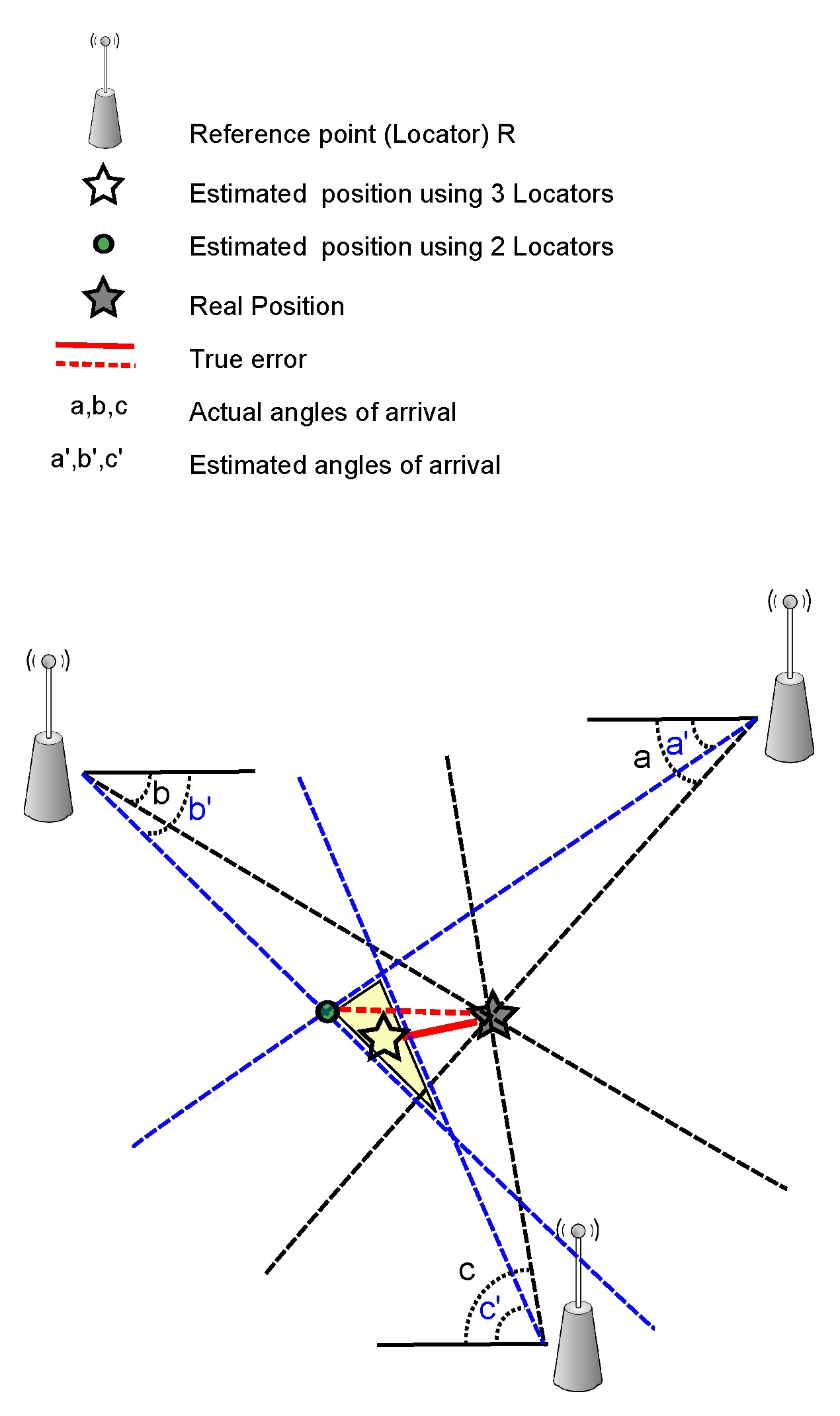 In the AOA technique, the estimation of the signal reception angles, from at least two sources, is compared with either the signal amplitude or carrier phase across multiple antennas. The location can be found from the intersection of the angle line for each signal source, see Figure 4. AOA estimation algorithms are very sensitive to many factors, which may cause errors in their estimation of target position. Furthermore, AOA estimation algorithms have a higher complexity compared to other methods. For instance, the antenna array geometry has a major role in the estimation algorithm [93]. Increasing the distance between the sender and receiver may decrease the accuracy [94]. The AOA technique can be used with other techniques to increase its accuracy [95].