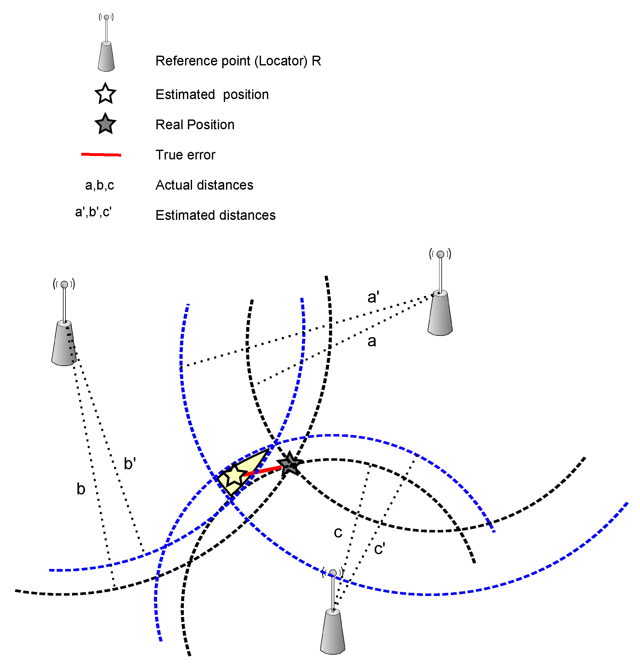TOA is based on the intersection of circles for multiple transmitters, see Figure 5. The radius of those circles is the distance between the transmitter and receiver. This distance is obtained by the calculation of the one-way propagation time between them [94]. The time synchronization of all transmitters is required whereas the receiver synchronization is unnecessary; any possibility of significant delay must be accounted for during calculation of the correct distance.