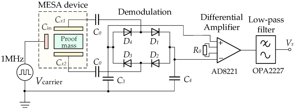 Our previous MESA designs aim to produce an accelerometer with much smaller full scale range for potential space applications [17,18]. Therefore, the applied carrier amplitude is much smaller, ~140 mV, in order to minimize the negative spring effect stemming from the applied carrier voltage. By comparing with our previous designs, the full scale range of the x and y axes are increased greatly, ~0.3 g, for land seismic applications, and the z-axis range is designed at 3 g, where the unit “g” means gravitational acceleration. Therefore, the carrier amplitude is increased to 5 V and the preamplifier can be removed, which simplifies the capacitive sensing circuit and increases the signal-to-noise ratio.
