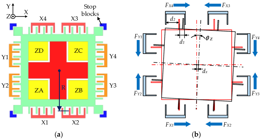 Top view of the electrodes pattern: (a) layout of the electrodes and stop blocks; and (b) the direction of the electrostatic force when the PM has a clockwise rotation around the z-axis and a translation along the x-axis.