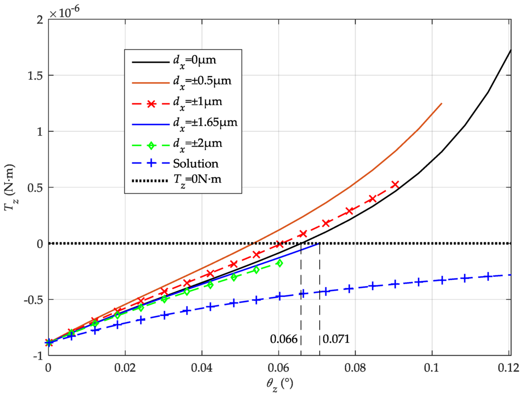 The calculated results of the combined torque over initial rotation angle are shown in Figure 5. If Tz > 0, the direction of the control torque is the same as the direction of the initial rotation, which means the PM will be pushed to the lateral stop blocks and be trapped in a self-locking zone.