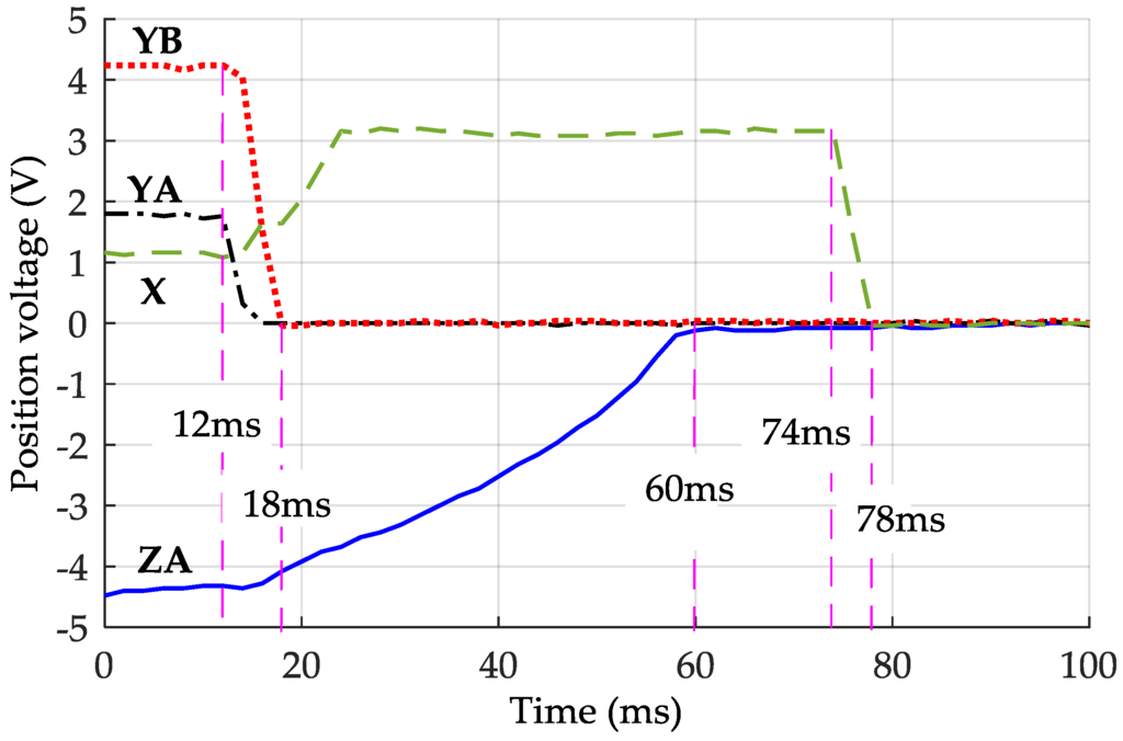 Figure 6 shows time response of four position channels during initial levitation recorded by a digital storage oscilloscope. Upon applying the suspension control, the PM is levitated from its resting position to near the center of the electrode cavity. The solid line ZA represents the vertical position of the PM, which is detected by sensing the differential capacitance change of the electrode pair ZA (the electrode pairs ZB, ZC, and ZD are similar to ZA). The dot-dash line YA and the dotted line YB are the associated outputs of the differential electrode pairs Y1 and Y2, Y3, and Y4, respectively. The dashed line X represents the displacement of the x-axis (detected by four electrodes X1, X2, X3, and X4). Figure 6 shows that the levitation operation of the z-axis and the y-axis began at the moment t = 12 ms. The voltages of the YA and YB reached to near 0 at about 18 ms, while the voltage of the ZA reached 0 until t = 60 ms as the air-film damping effect along the vertical axes is much stronger than that along the lateral axes. During the time duration between 12 ms and 24 ms, it can be seen that the position voltage of the x-axis rose from 1.16 V to 3.12 V. This is because the x-axis motion was disturbed during initial levitation when the PM was moving along the y-axis and rotating around the z-axis. The only parameter which should be chosen in this solution is the moment when the x-axis control is activated. After the voltages of the YA, YB, and ZA all reached their steady states, i.e., t > 60 ms, the suspension operation of the x-axis translation can be activated, at t = 74 ms in Figure 6. The entire lift-up operation of the PM is finally completed at t = 78 ms.