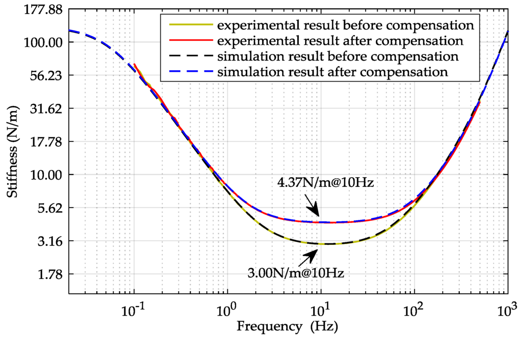 Equation (12) indicates that the existence of Kx will decrease the overall suspension stiffness of the system. Both the simulation, using the model parameters listed in Table 3, and experimental result of the suspension stiffness before the feed-forward compensation are shown in Figure 9.