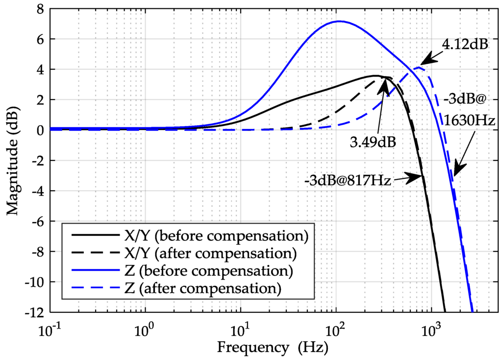 The principle of the feed-forward compensation in vacuum is similar to that in air. Applying the controller parameters in Table 4, a stable suspension system is achieved by simulation and the three-axis closed-loop frequency responses in vacuum condition are shown in Figure 10. The expected vacuum condition is below 10 Pa from initial evaluation on air-filming damping and Brownian noise. It is obvious from the simulation results that the closed-loop bandwidths are not very different for the compensated and uncompensated systems, whose bandwidth can all be increased above 800 Hz and is wide enough for use as a geophone. However, the large resonant peak of the uncompensated system in the intermediate frequency range illustrates clearly that this system has poor dynamic performance. It is clear that the feed-forward compensated system yields a more linear amplitude-frequency response over wide frequency range and improved dynamic performance.