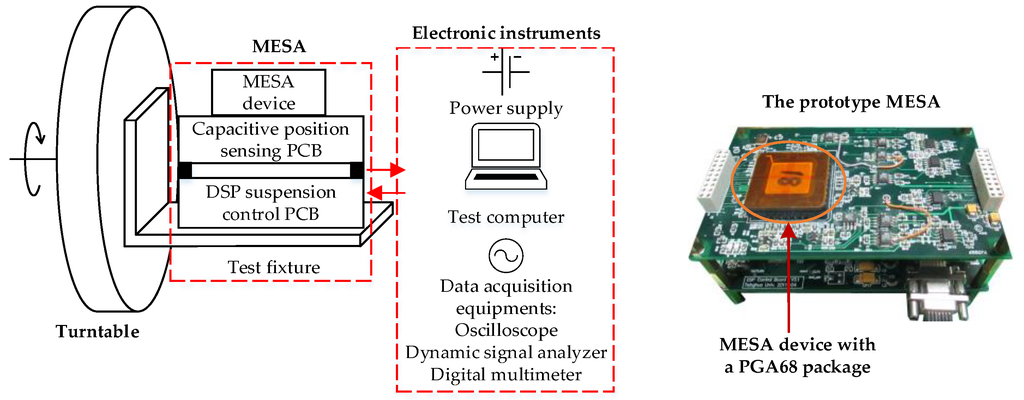 The experimental system that is used throughout this paper is a three-axis MEMS accelerometer with a thin parallelepiped PM supported electrostatically in all six DoFs. The schematic of the MESA setup is shown in Figure 11. The prototype MESA, which consists of a MESA device, a capacitive position sensing printed circuit board (PCB) stacked with the DSP-based suspension control PCB, was fixed on a precision turntable by the test fixture. The MESA device was atmospherically sealed in a PGA68 ceramic package and mounted on the sensing PCB, as shown in Figure 11. The digital control program was debugged using a computer and then uploaded to the DSP memory. Both the six-DoF feedback compensators and feed-forward compensators were run at a sampling frequency of 10 kHz. The accelerometer was tested by using the tilt method in the Earth’s gravitational field, where the input acceleration is a function of the angle between the sensitive axis and the local vertical. The input axis can be changed relative to the gravity vector by rotating the turntable to different positions.