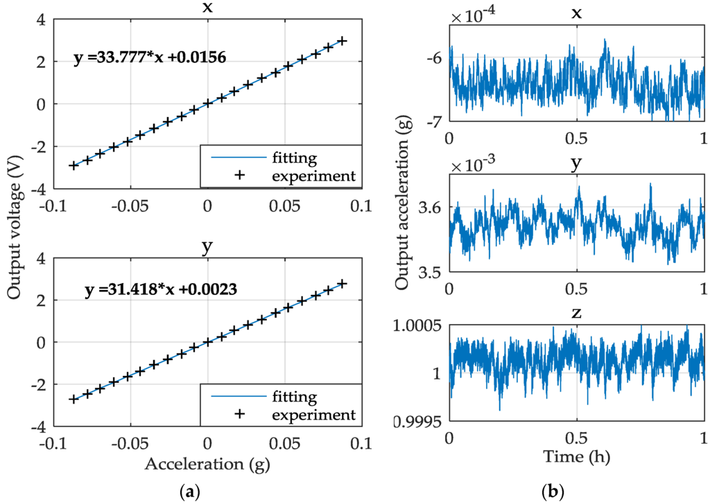 Experimental results: (a) the acceleration responses of the x and y axes; and (b) one-hour bias stability of the x, y, and z axes.