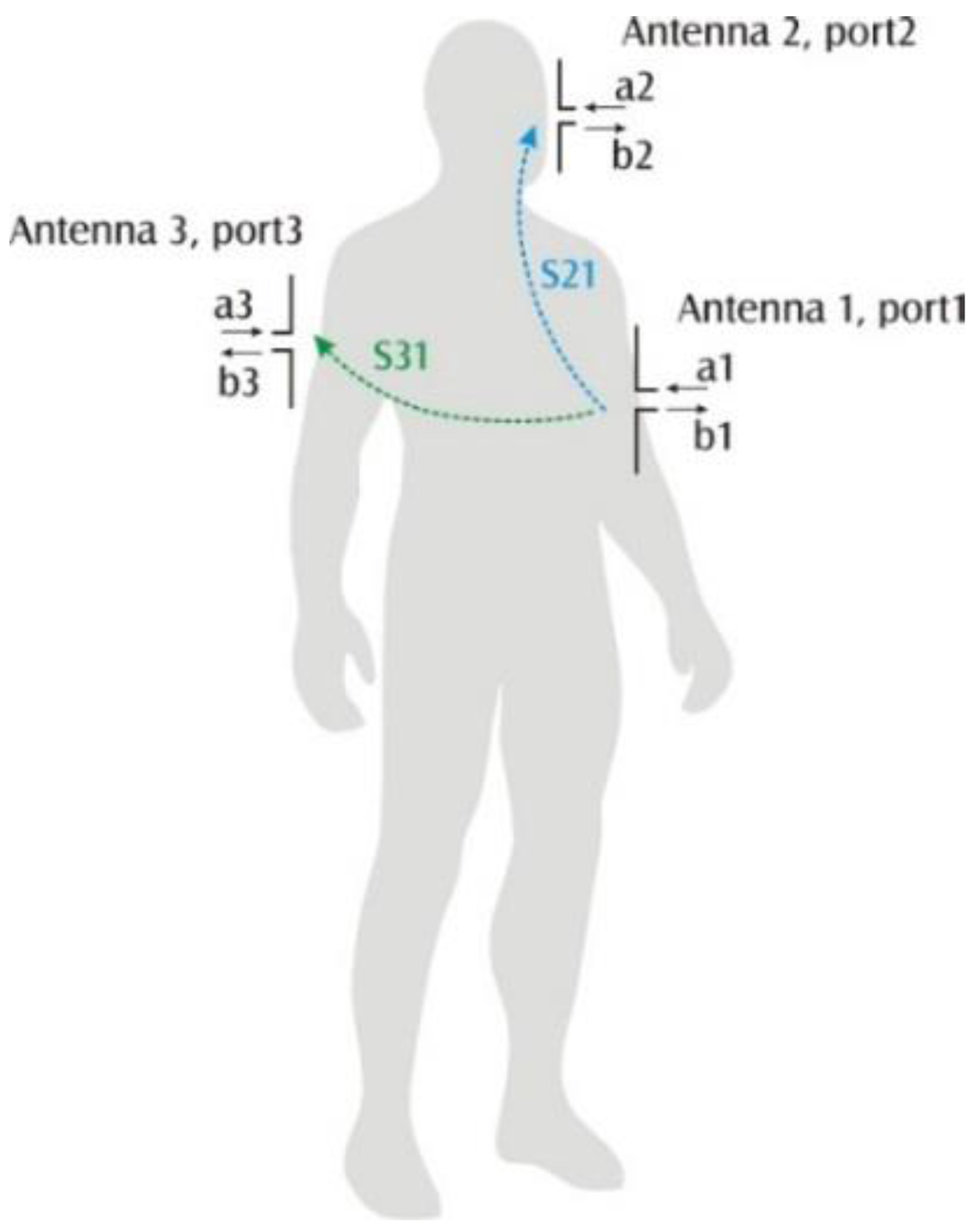 The path loss between the chest node and the other two nodes is defined by S21 and S31 which are parameters of the scattering matrix, widely used in the microwave technology. The parameters are defined as: