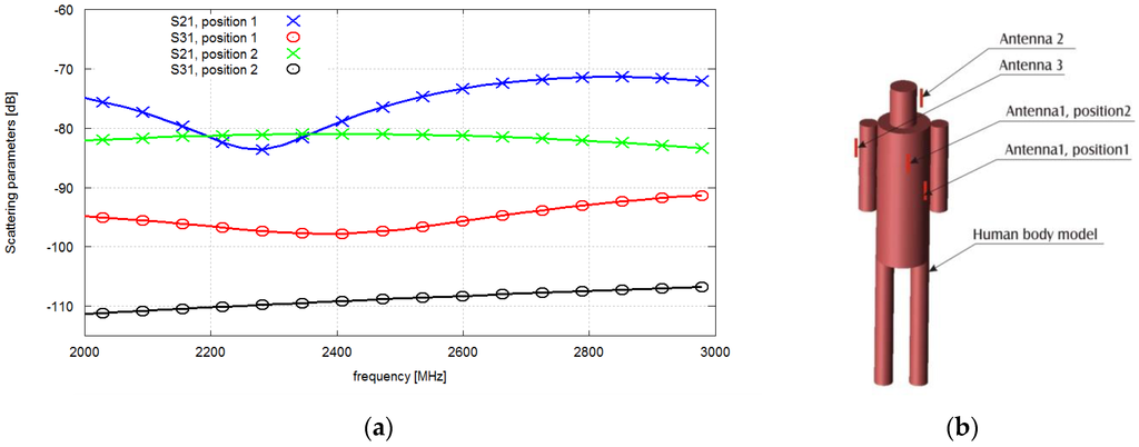 The motivation for the following work is the fact that the values of S21 and S31 strongly depend on the chest node antenna position, not just the antenna distance. This is evident in the example of simulation results obtained for two different locations of the chest antenna, which is presented in Figure 4.