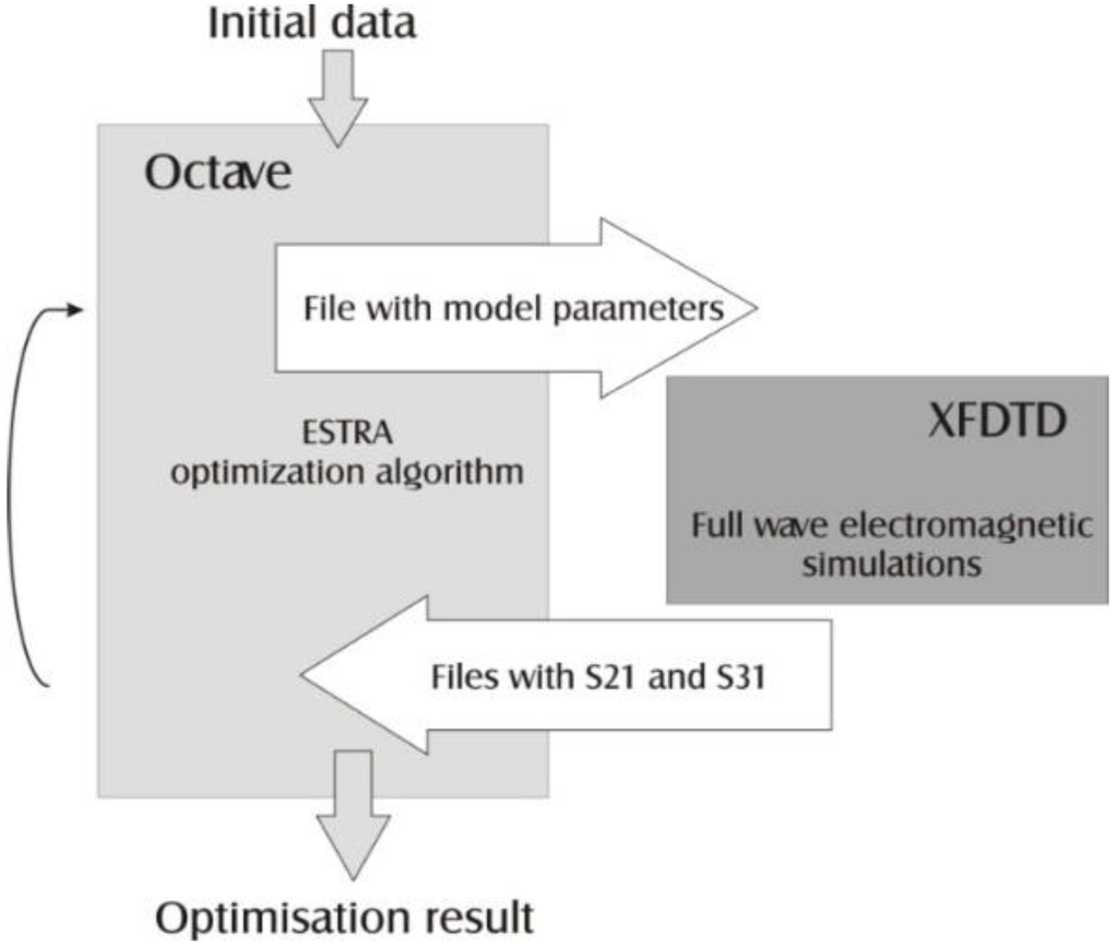 In contrast, EStra optimization algorithm was originally coded in Mathworks Matlab and for further work Octave [37] environment was applied because it is freeware and compatible with original Matlab scripts. The Octave and XFdtd scripts are combined and operate in turns to generate a new antenna position and calculate the objective function. Synchronization and data exchange between XFdtd and Octave have been solved by file exchange (Figure 6).