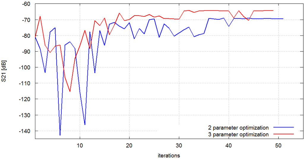 Therefore in Equation (3) only S21 is present. The objective function (to be maximized) was chosen as the minimum value of S21 in the 2.4–2.5 GHz frequency band. Consequently, a two-variable optimization was considered first. The third design variable—Antenna distance—Was fixed at d = 0.001 m. The results obtained after 51 iterations are presented in Figure 7 (blue line). The initial value of S21 objective function was −81 dB and the final was −69 dB. We may observe that the radio link quality has improved because the signal received in the optimized case has 12 dB (−81 dB vs. −69 dB) greater amplitude.