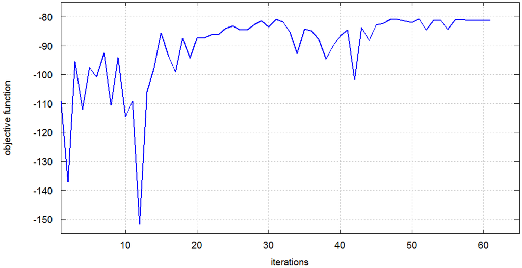 We used the three-variable approach to optimize the three-antenna scenario operating at 2.4 GHz. In this case the objective function was defined as the minimum value from among two parameters: S21 and S31 in the frequency range: 2.4–2.5 GHz. For the same starting point as previously, the initial value of objective function was −109 dB. After 61 iterations it was improved to −80 dB, which is a gain of 29 dB in the radio link budget. The improvement of the objective function in the optimization process vs. iteration number is presented in Figure 8.