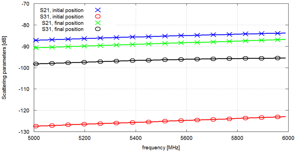 The good performance of the optimization procedure that we observed at 2.4 GHz was then verified in the 5.8 GHz ISM band. For this purpose we used shorter dipoles (20 mm long) which were tuned for the frequency equal to 5.8 GHz. The optimization starting point and the objective function definition were the same as for 2.4 GHz. The results were obtained after 67 iterations. The initial value of the objective function (the lowest value of S21 and S31 within the frequency range from 5.7 GHZ to 5.9 GHz) was −124 dB and it improved after 67 iterations to −96 dB. Figure 10 presents the scattering matrix parameter values before and after optimization. The results of all the described optimization experiments are gathered in Table 1.