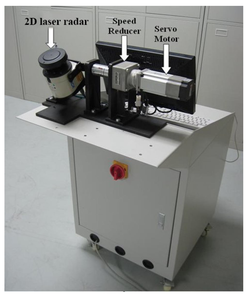 In general, for most laser-based measurement systems, the most convenient and effective choice of laser sensor may be a 3D laser scanner, which can obtain the point position in the spherical coordinate system. However, off-the-shelf 3D sensors such as the FARO Focus3D are usually too expensive. A cost-effective alternative for 3D data acquisition is to adopt 2D laser-based sensors with additional rotation or translation systems. The LRMS studied in this paper is such an example. It consists of a SICK LMS100 2D laser radar (Waldkirch, Germany), a PANASONIC MQMAP022P1 servomotor (Osaka, Japan), a NEDIC-SHIMPO VRSF-S9C-200 speed reducer (Kyoto, Japan), and a GT-400-SG motion control card produced by GOOGOLTECH (Shenzhen, China). As shown in Figure 1, the 2D laser radar is mounted on the extended shaft of the servomotor with the speed reducer in between.