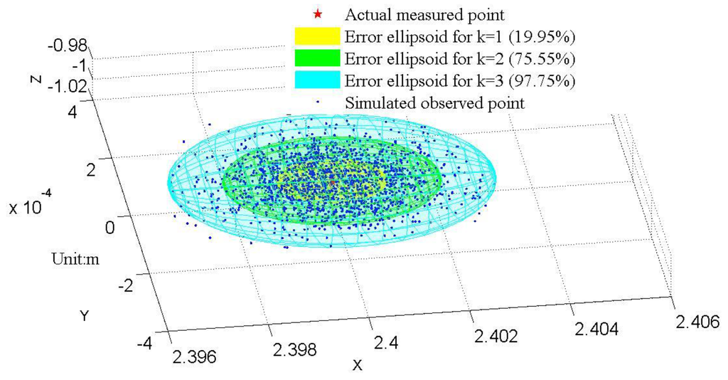 Thus, the single-point error ellipsoid model for the LRMS is established. Through Equation (4), error ellipsoid for any point in the measurable space can be drawn. As shown in Figure 3, 2000 simulation experiments were conducted to demonstrate the possible observed positions (blue dots) for a given actual point (red star) under the abovementioned uncertainties (σl2 = 136.11 mm2, σα = 1.74 × 10−30, and σβ = 3.6 × 10−50) by using a normal distribution. Meantime, three error ellipsoids for corresponding to different k values are drawn. From the figure, it can be seen that 97.75% of the random simulation results are contained in the error ellipsoid of k = 3. Moreover, the frequency of the occurrence of the blue dots becomes higher when they get closer to the actual point, exactly following the rule of 3D normal distribution. Therefore, Figure 3 justifies the use of the single-point error ellipsoid model for evaluating the measurement uncertainty of the LRMS.