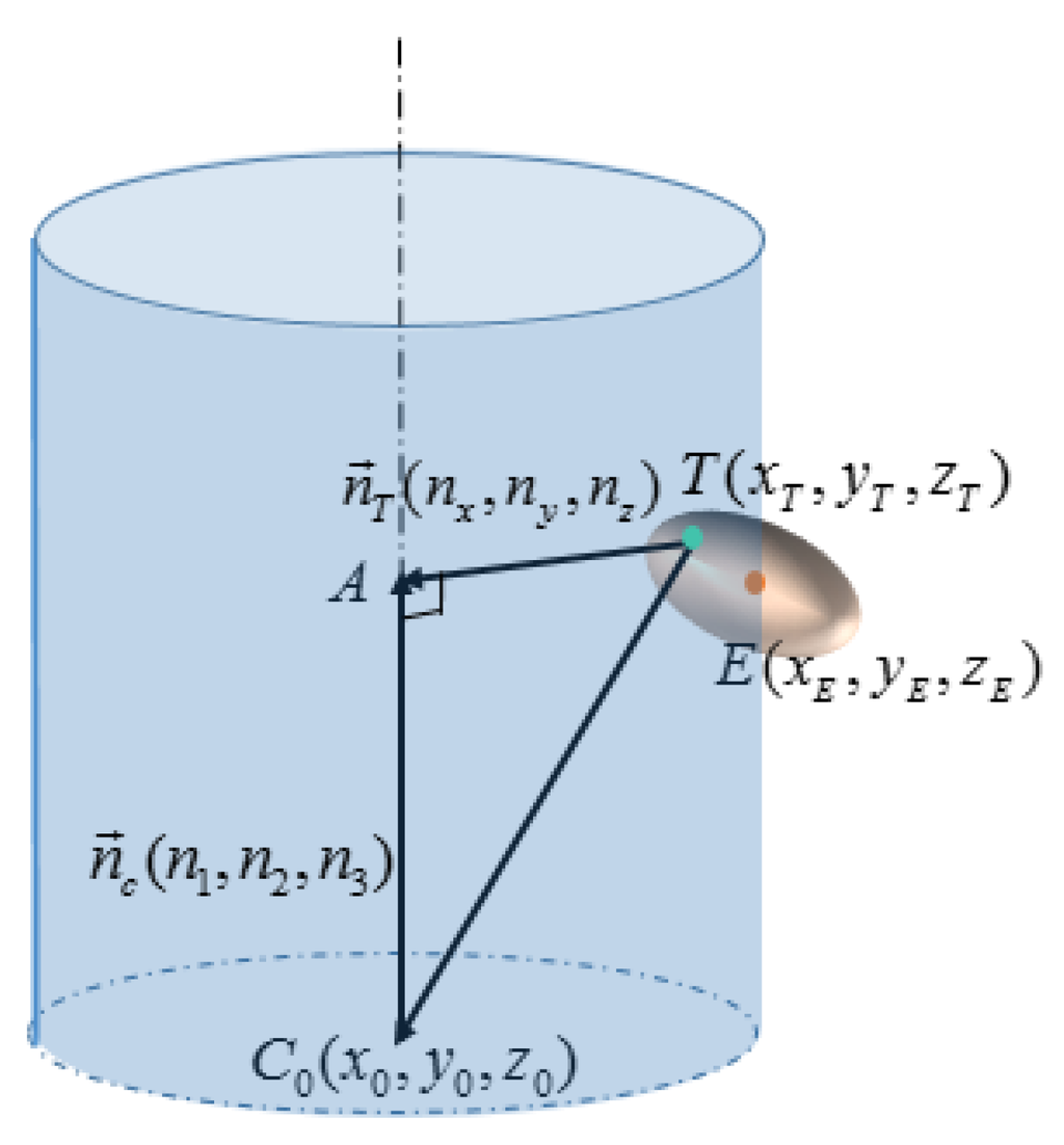 As is shown in Figure 5, the error ellipsoid of the critical point is tangent to the innermost cylinder of . If the distance between the critical point and the tangent point in the radial direction of the real cylinder is defined as the “centripetal radius” of this ellipsoid, denoted as , then . Due to the centrosymmetric property of ellipsoids, . In order to compute the corresponding diameters and for a given presumed critical point, a rough estimation of the position and dimension of the cylinder is required. As shown in Figure 6, point is the center of the bottom circle of the real cylinder, and is the normal vector of the central axis. Suppose that point E is the critical point on the cylindrical surface, then the presumed innermost cylinder of is tangent to the ellipsoid of E at point T. Thus, the distance between point T and the central axis |TA| is just the radius of the innermost cylinder .