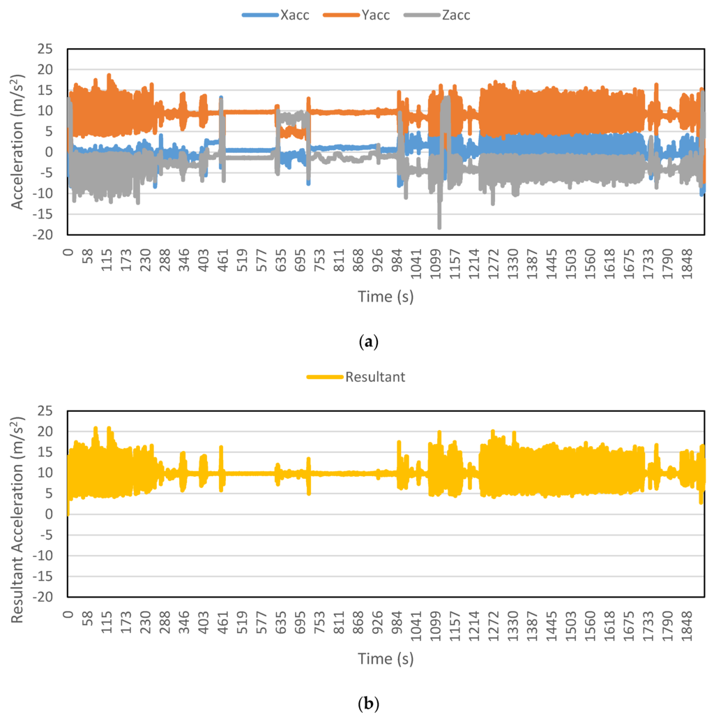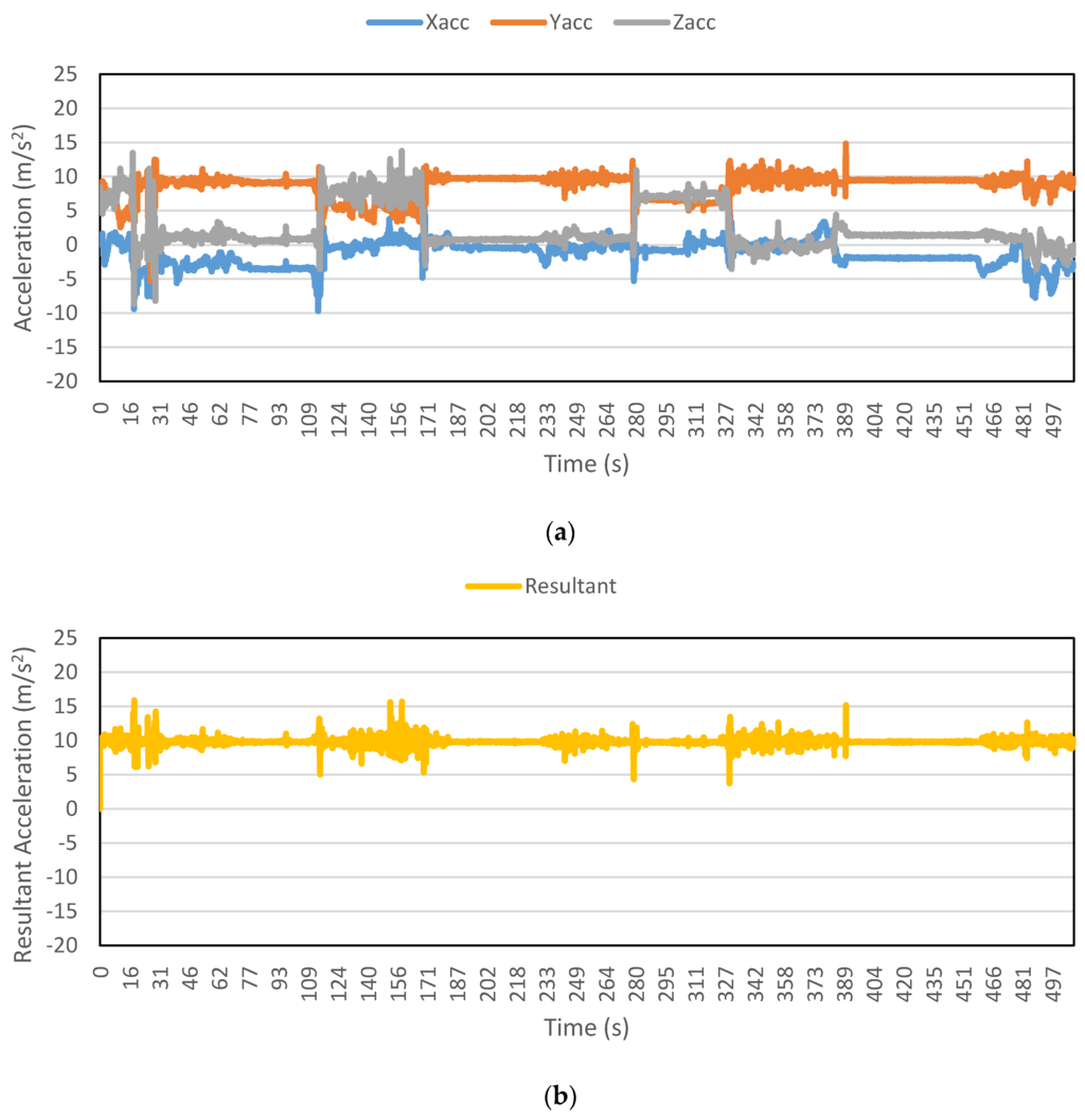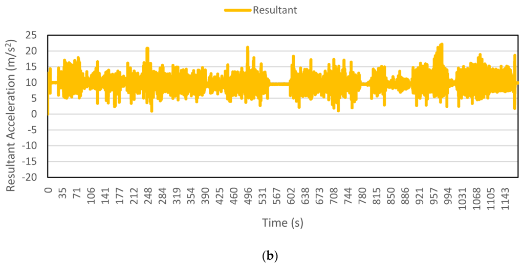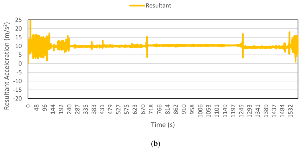 Figure 2, Figure 3, Figure 4, Figure 5, Figure 6 and Figure 7 exhibit the accelerations recorded along the three axes and their calculated resultant for each mode over a single trip respectively. The change in position of the smartphone can be observed by the abrupt shift in acceleration values in Figure 3a. This is the reason that individual accelerations were not used; instead, the magnitude of their resultant was utilized in the analysis. Furthermore, it is evident from the figures that the non-motorized modes, i.e., walk and bicycle, register a lot of fluctuations, whereas the behavior of motorized modes is different, with comparatively smooth trends. It can also be noted that resultant acceleration alone is not sufficient to distinguish among the modes, therefore some other features need to be extracted (details in Section 2.3). The magnitude of resultant acceleration might be affected by the activity performed on the smartphone by the owner, like calling or texting or no action at all. This probable effect should be investigated further as mentioned in future work.