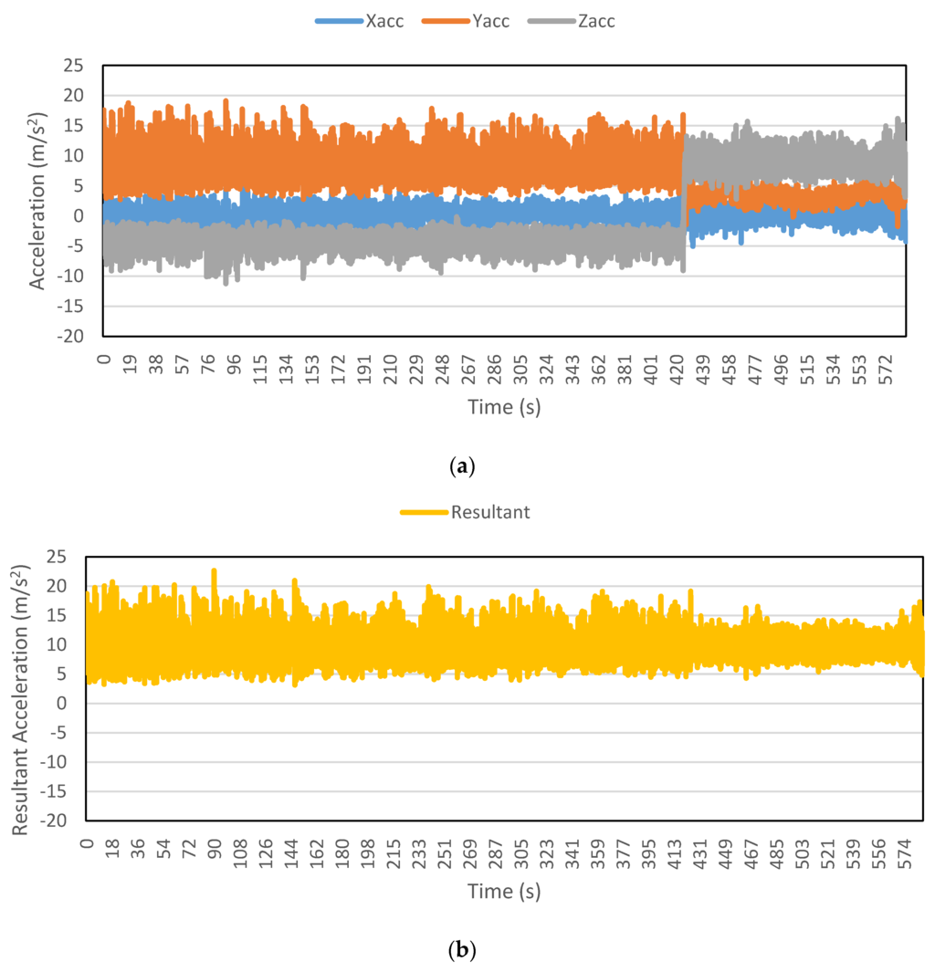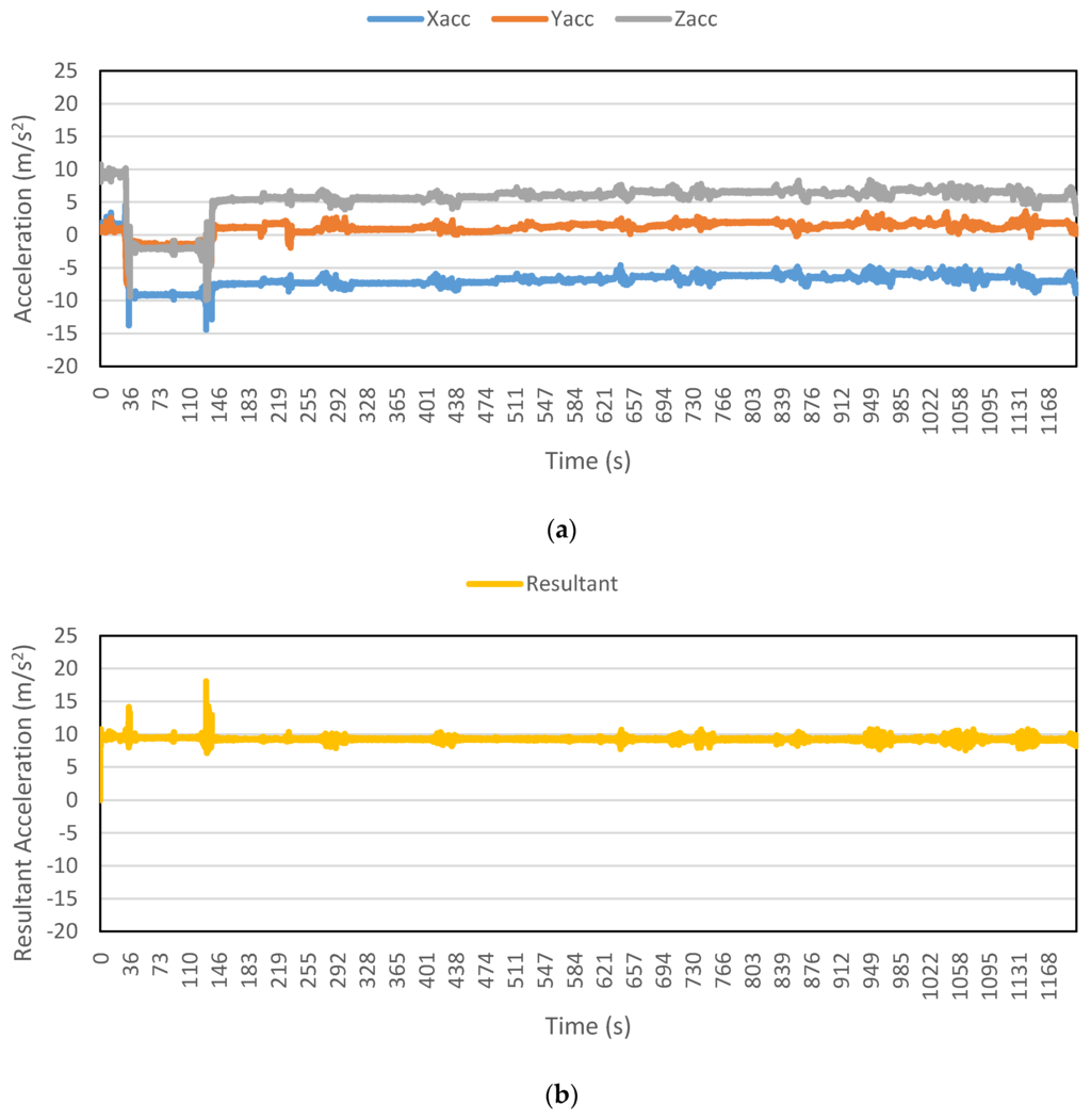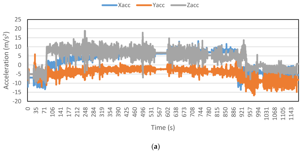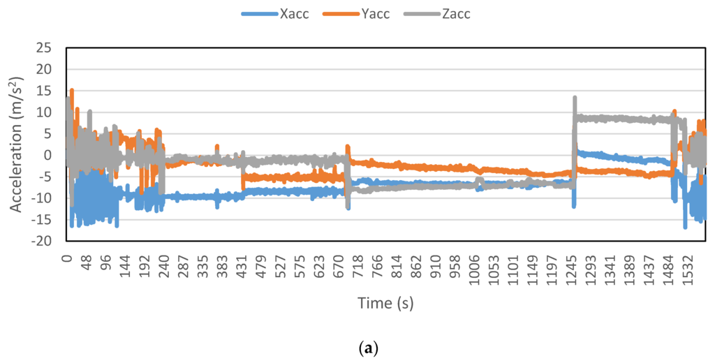 Figure 2, Figure 3, Figure 4, Figure 5, Figure 6 and Figure 7 exhibit the accelerations recorded along the three axes and their calculated resultant for each mode over a single trip respectively. The change in position of the smartphone can be observed by the abrupt shift in acceleration values in Figure 3a. This is the reason that individual accelerations were not used; instead, the magnitude of their resultant was utilized in the analysis. Furthermore, it is evident from the figures that the non-motorized modes, i.e., walk and bicycle, register a lot of fluctuations, whereas the behavior of motorized modes is different, with comparatively smooth trends. It can also be noted that resultant acceleration alone is not sufficient to distinguish among the modes, therefore some other features need to be extracted (details in Section 2.3). The magnitude of resultant acceleration might be affected by the activity performed on the smartphone by the owner, like calling or texting or no action at all. This probable effect should be investigated further as mentioned in future work.
