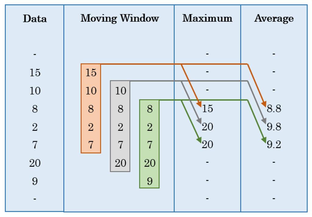 Most of the extracted features are quite straightforward. Skewness measures the lack of symmetry of a given dataset. A dataset is symmetric if it looks the same on both sides of the center point. On the other hand, kurtosis measures the flatness of the dataset, determining whether the dataset or distribution is peaked or flat around the mean, relative to normal distribution. After average resultant accelerations were calculated, they were used to calculate maximum average resultant accelerations in the same way as resultant accelerations were used to calculate maximum resultant accelerations, over each window. All features/variables, except resultant acceleration, were calculated by employing a moving window concept [50]. For the purpose of smoothening the data and reducing the effect of the outliers, the concept of moving window was used where a certain number of readings, defined by the window size, were used to apply an operation (e.g., average, maximum, etc.) at a certain data entry level and this window moved downwards as the calculations proceeded along the data column. Suppose five data readings fall in 1 min window, then Figure 8 shows an example of how moving window concept is applied.