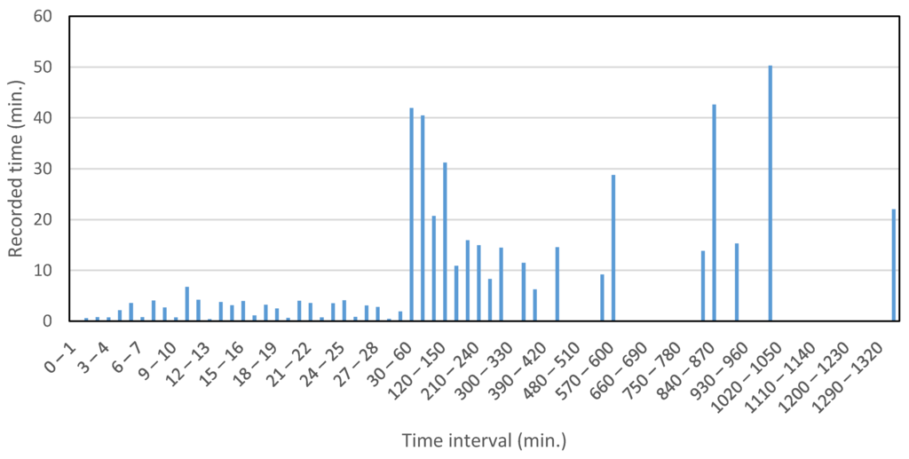 According to a previous study [60], the average commute travel time for walking is 16.15 min. Walking is generally the travel mode for the shortest trips; the moving window size should therefore be less than the average value of 16.15 min. 10 min moving window size was selected. Although some trips will even be shorter than 10 min, as is also evident from the distribution of collected data with respect to time intervals shown in Figure 10 (3.37% of the collected data were less than 10 min), the window size cannot be reduced to cover all the trips because then the moving window concept will be useless.