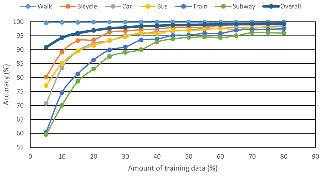 A number of studies have utilized the accelerometer data alone for classification purposes [41,42,43,44,45,46]. In one study [29], the training and testing datasets were formed by taking 70% of the collected data as training data and rest as test data; a similar study divided the collected data as 90% for training and 10% for testing [47]; and yet another study used almost 50% of the collected data for training and rest for testing the classification algorithms [48]. Some studies (e.g., [49]) also collected GPS data but for data validation only. Mode detection was still managed by accelerometer data.
