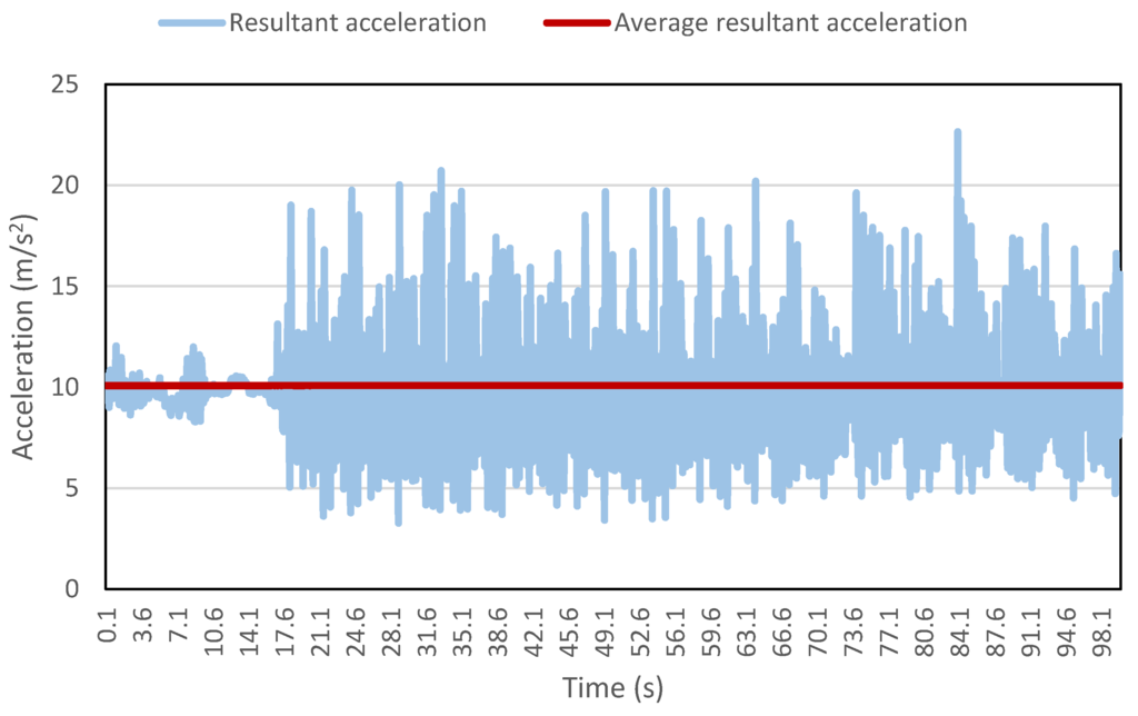 A valid question arises as to the reason for the remarkably high detection accuracy by this methodology. The secret lies in the moving window concept used to extract the various features. Figure 12 shows the resultant acceleration data collected for a part of a walking trip. The average resultant acceleration calculated by moving window is also shown in the figure. It is evident that the average values approximately remain constant, hence providing a very useful feature for the algorithm. If the algorithm is trained using only a few average values, then the algorithm will very easily identify the remaining values against the values from other modes. Moreover, additional features like maximum resultant acceleration, standard deviation, skewness and kurtosis refine the classification process and decrease the number of misclassifications. Conventionally, researchers use specific time windows, mostly having 50% overlap, to extract various features [21,29,47,54,62]. One of the problems with this kind of approach is the loss of data points. For example, for data collected at one reading per second (1 Hz) and a time window of 10 s with 50% overlap, the extracted features will have a frequency of one reading per 5 s (0.2 Hz).